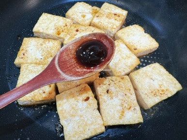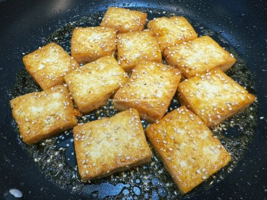 두부 1모 , 올리브 오일 적당히 , 맛간장 1큰술 , 쯔유 1/2큰술 , 굴소스 1/3큰술 , 메이플 시럽 1큰술 , 참기름 1큰술 , 깨 적당히