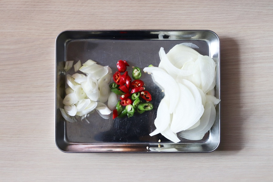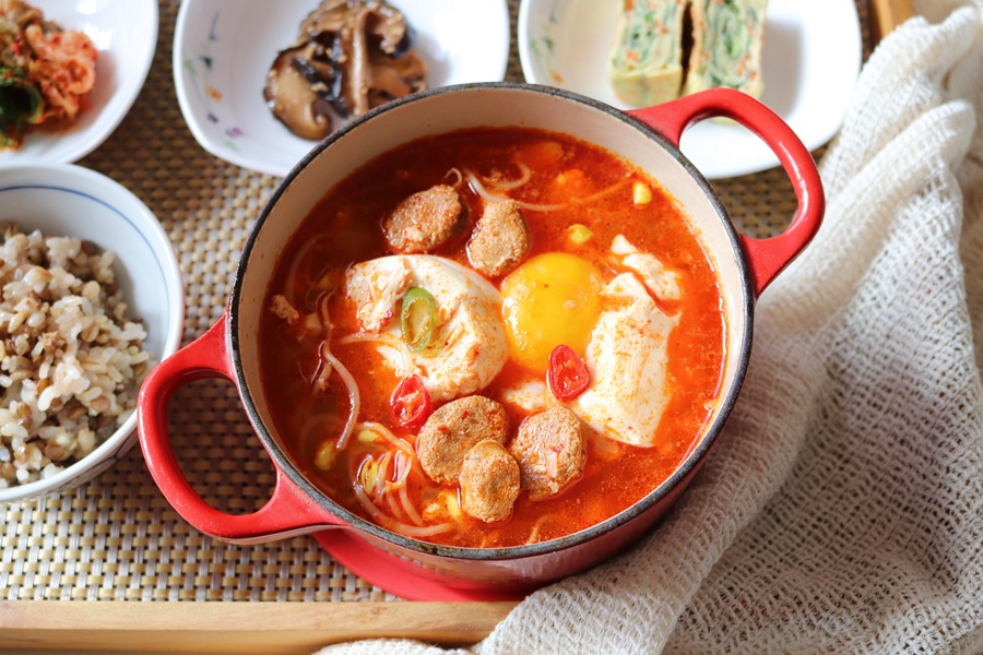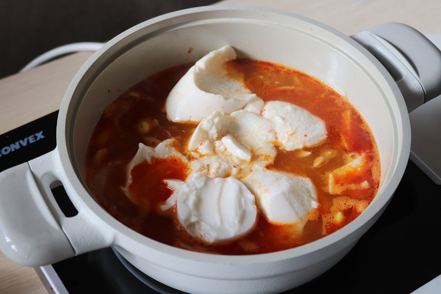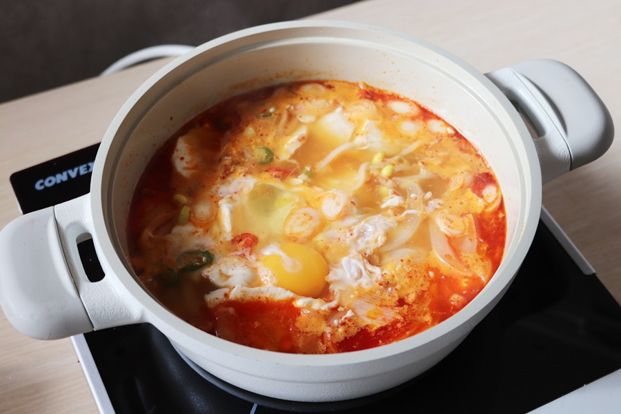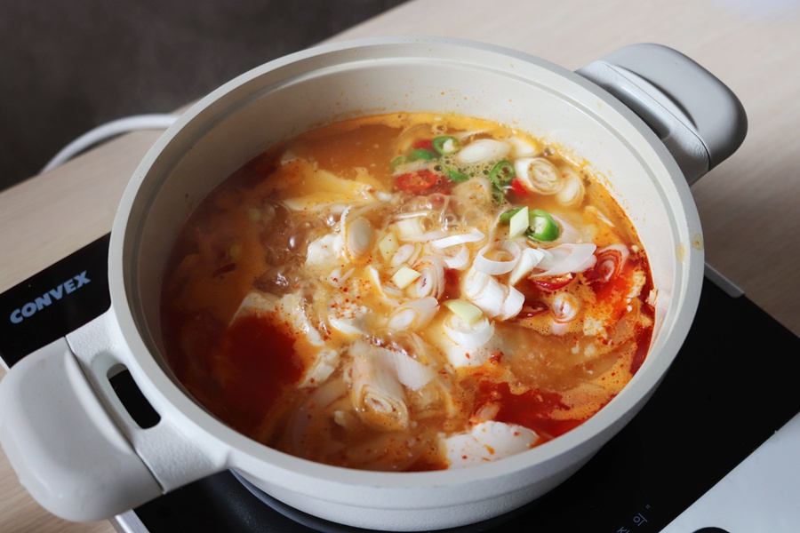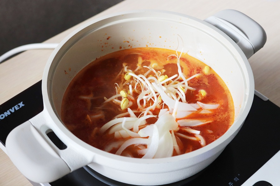 순두부 1 봉 , 조선명란 1 줄 , 콩나물 1 줌 , 달걀 1 개 , 양파 1/4 개 , 대파 10 cm , 청양고추(청 , 홍) 각 1 개씩 , 물 500 ml , 다진 마늘 1 큰술