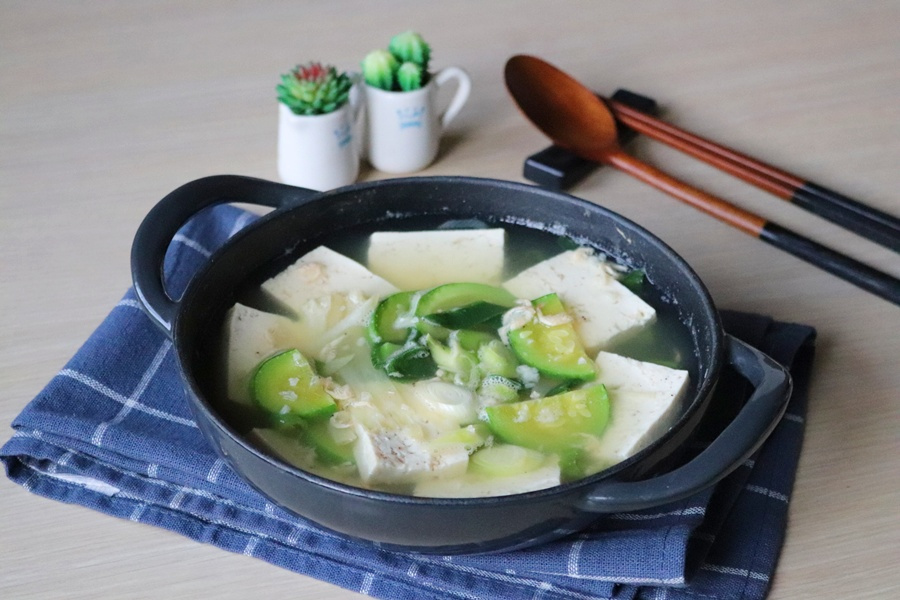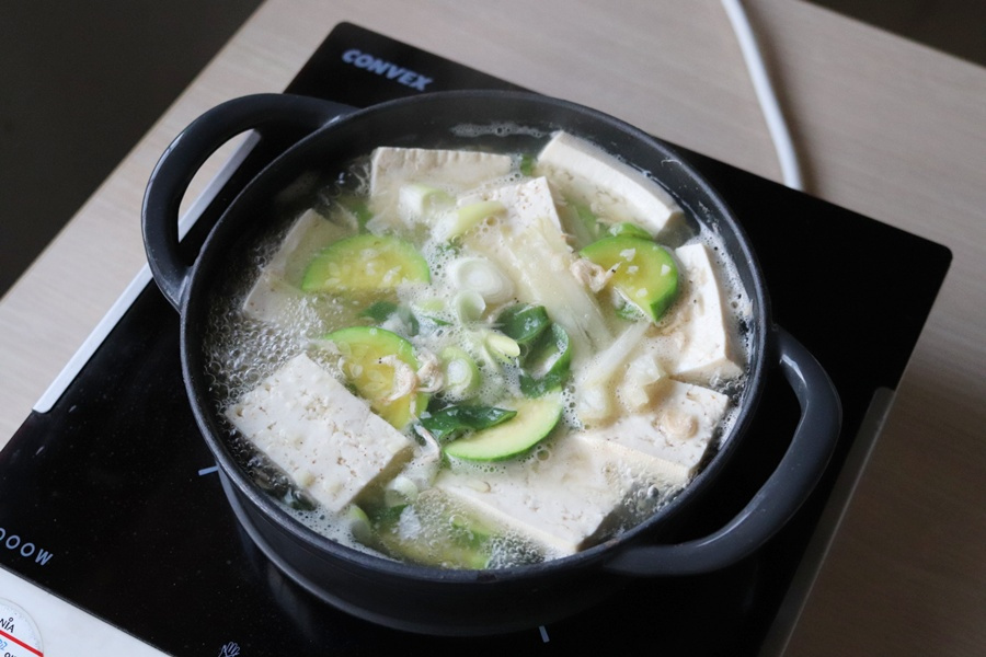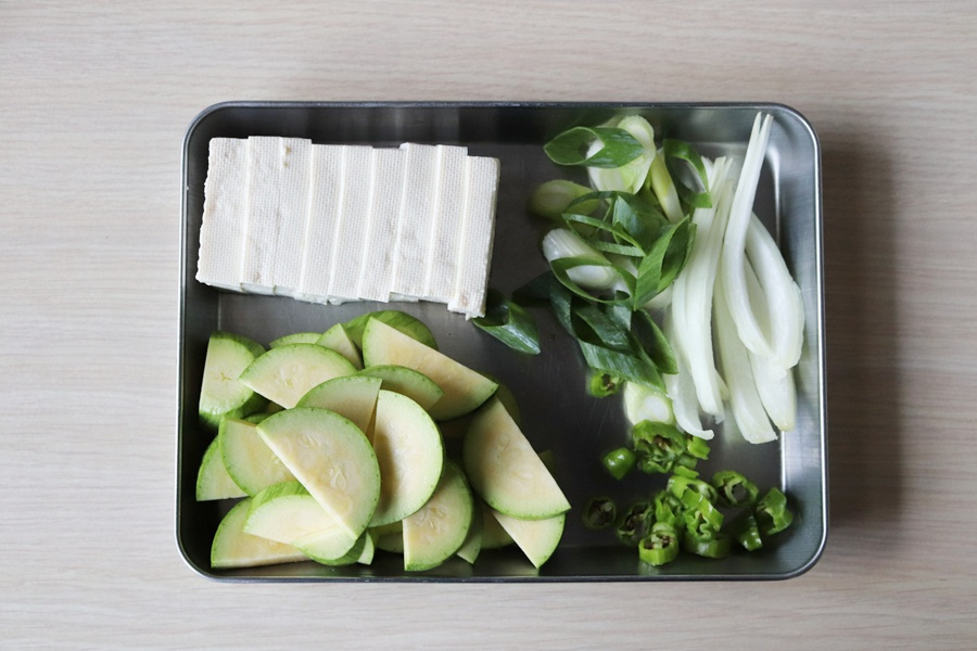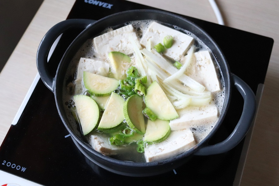 두부 1/2 모 , 애호박 1/3 개 , 대파 10 cm , 양파 1/6 개 , 고추 1 개 , 새우젓 1 큰술 , 다진 마늘 1 작은술 , 멸치디포리 코인육수 1 개 , 물 400 ml