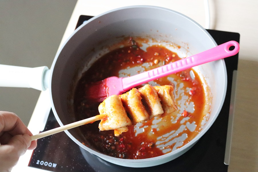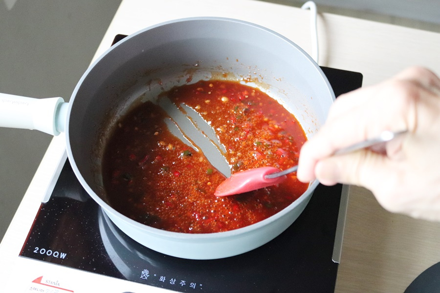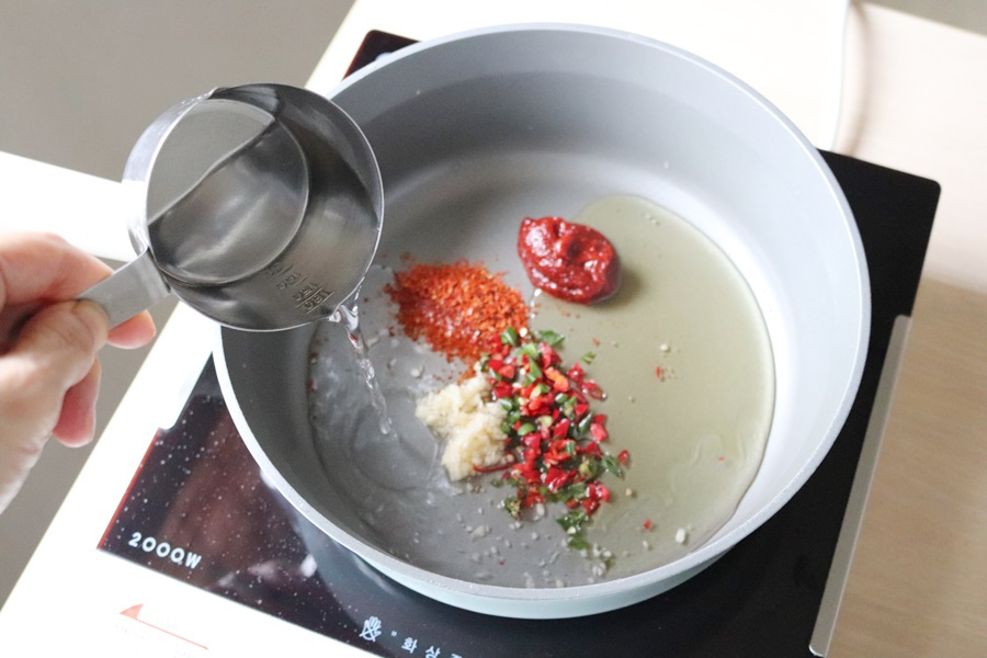 고추장 1 큰술 , 고춧가루 1/2 큰술 , 올리고당 3 큰술 , 다진 마늘 1/3 큰술 , 물 100 ml