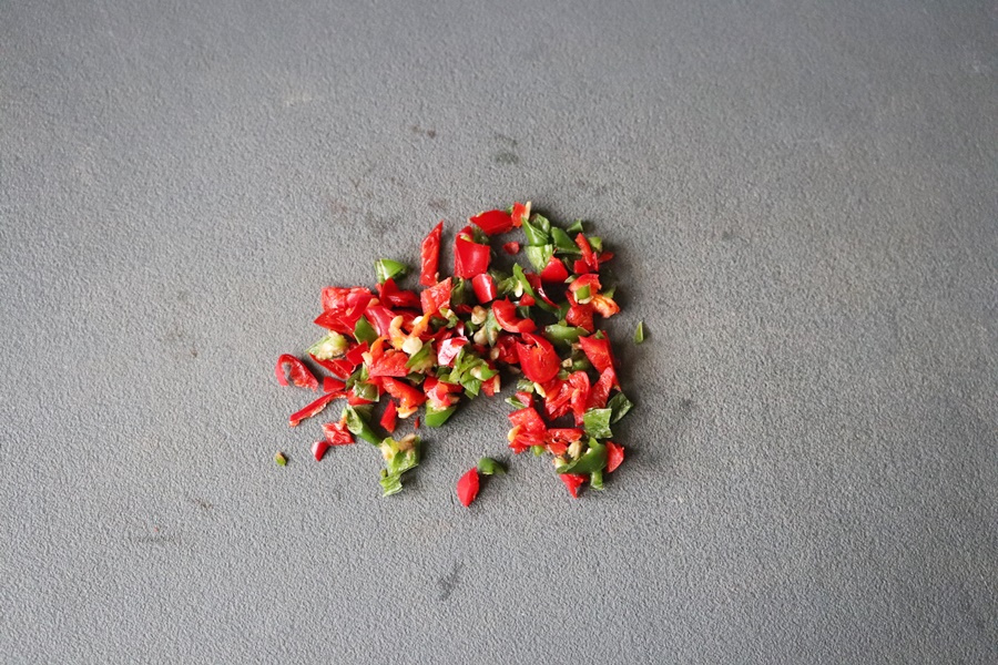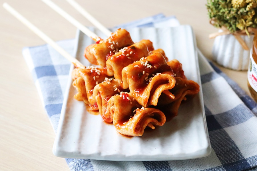 냉동 어묵꼬치 3 개 , 청홍고추 1/2 개씩 , 통깨 약간