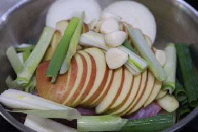 통 삼겹 1kg , 사과 1개 , 양파 2개 , 대파 2대 , 통마늘 15~20알
