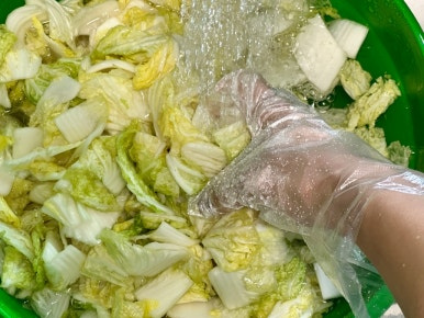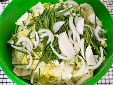 알배추 2통 , 절임용물 500ml , 소금 4T , 부추 50g , 양파 1개 , 사과 1/2개