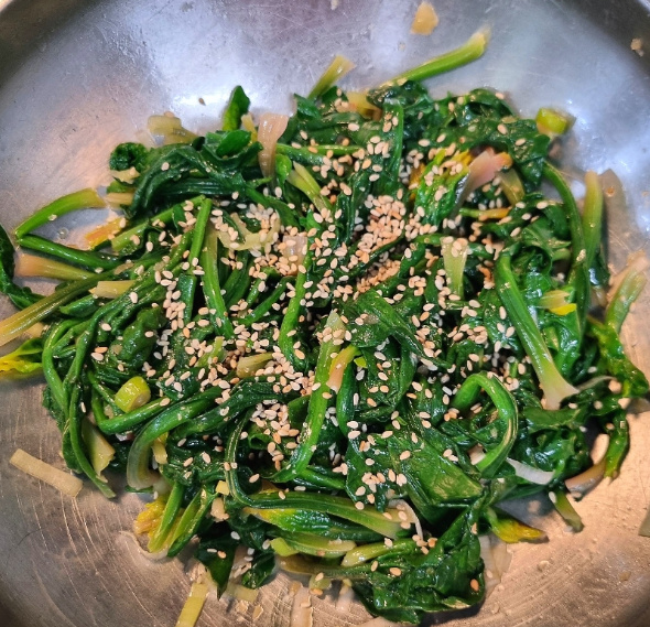 마지막에 고소한 깨까지 뿌려주면 겨울제철나물 무침 완성!