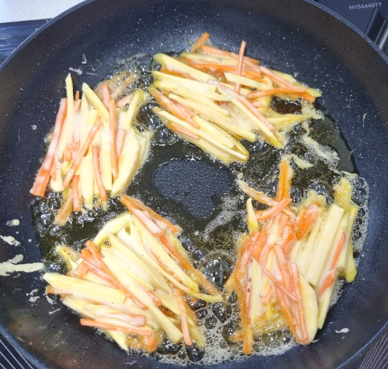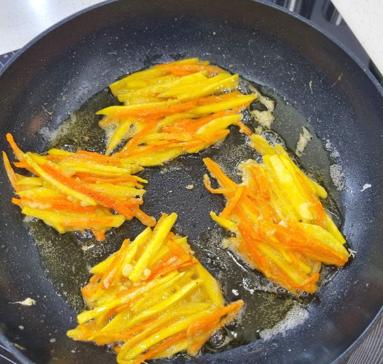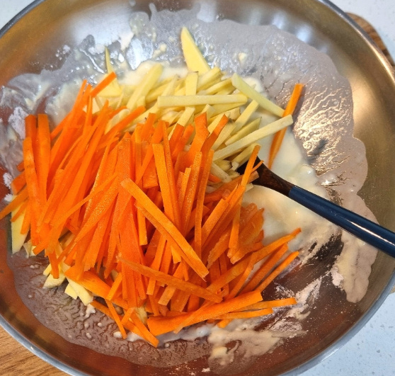 오랜만에 집에서 떡볶이를 만들어 먹으면서 같이 먹을 채소튀김이 생각나더라고요 집에 마침 고구마, 당근이 있길래 고구마 야채튀김 만들기를 했어요 고구마 야채튀김에는 당근, 양파등 집에 있는 채소로 넣어도 좋아요 고구마 야채튀김 만들기는 고구마, 당근등 채소를 얇게 채썰어 튀김가루 반죽에 넣고 기름 넉넉하게 두르고 앞뒤 바삭하게 튀겨주면 돼요 달달한 고구마가 들어간 채소튀김이라 매콤한 떡볶이랑 찰떡궁합이죠 고구마 야채튀김 만들기 채소튀김 시작해 볼까요~?