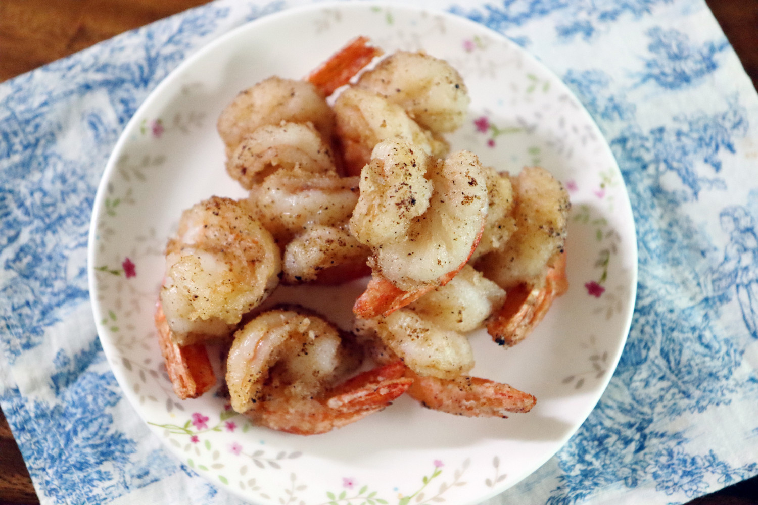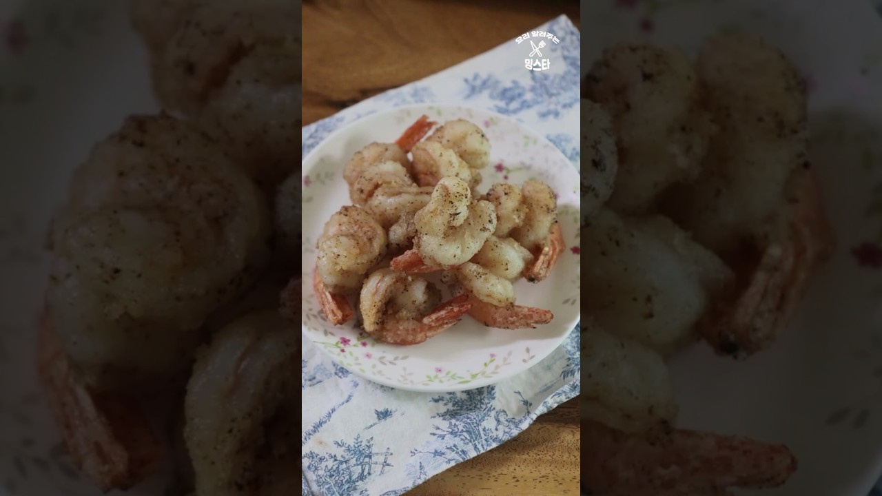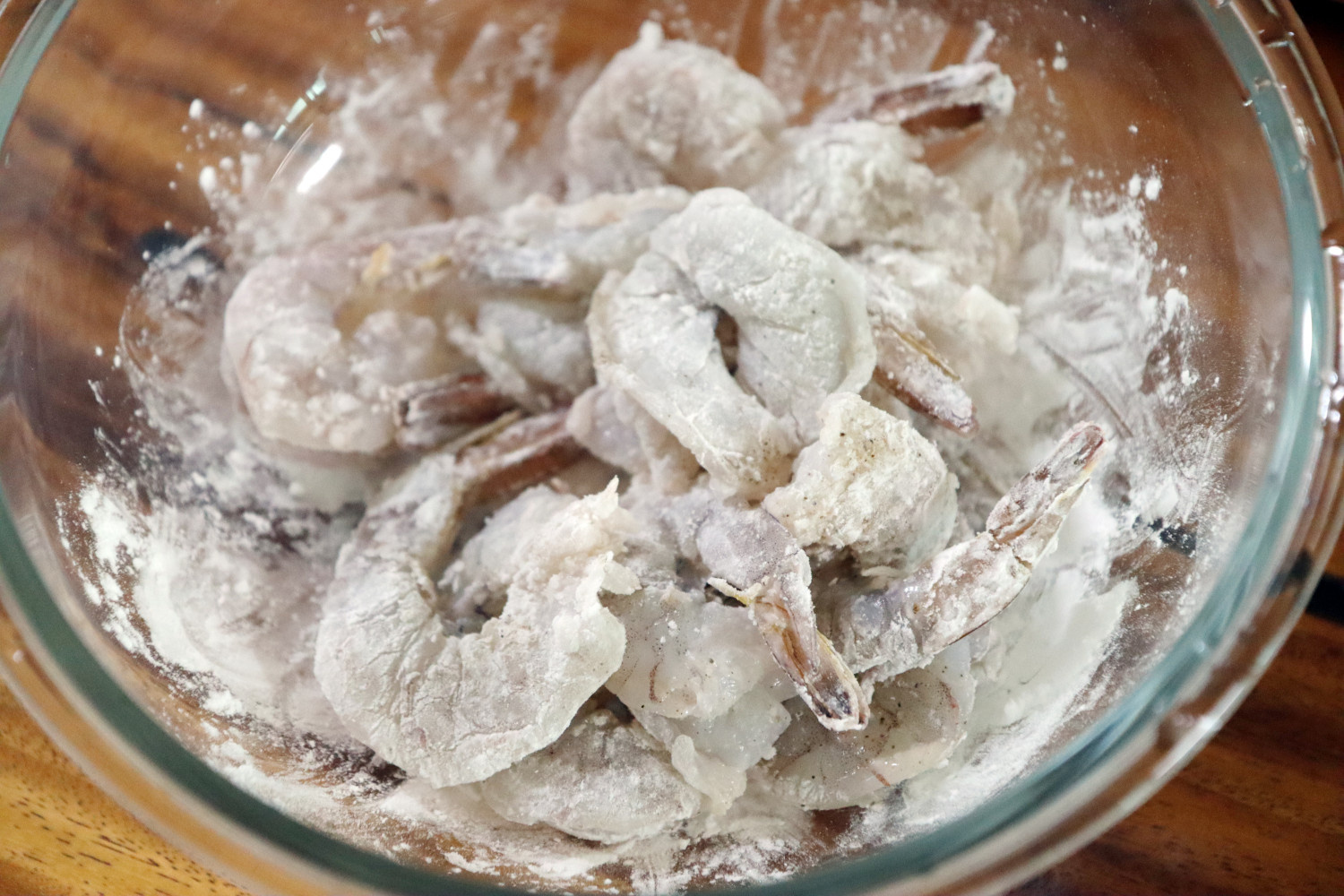 칵테일 새우 200 g , 소금 2 꼬집 , 후춧가루 2 꼬집 , 감자전분 3 숟가락