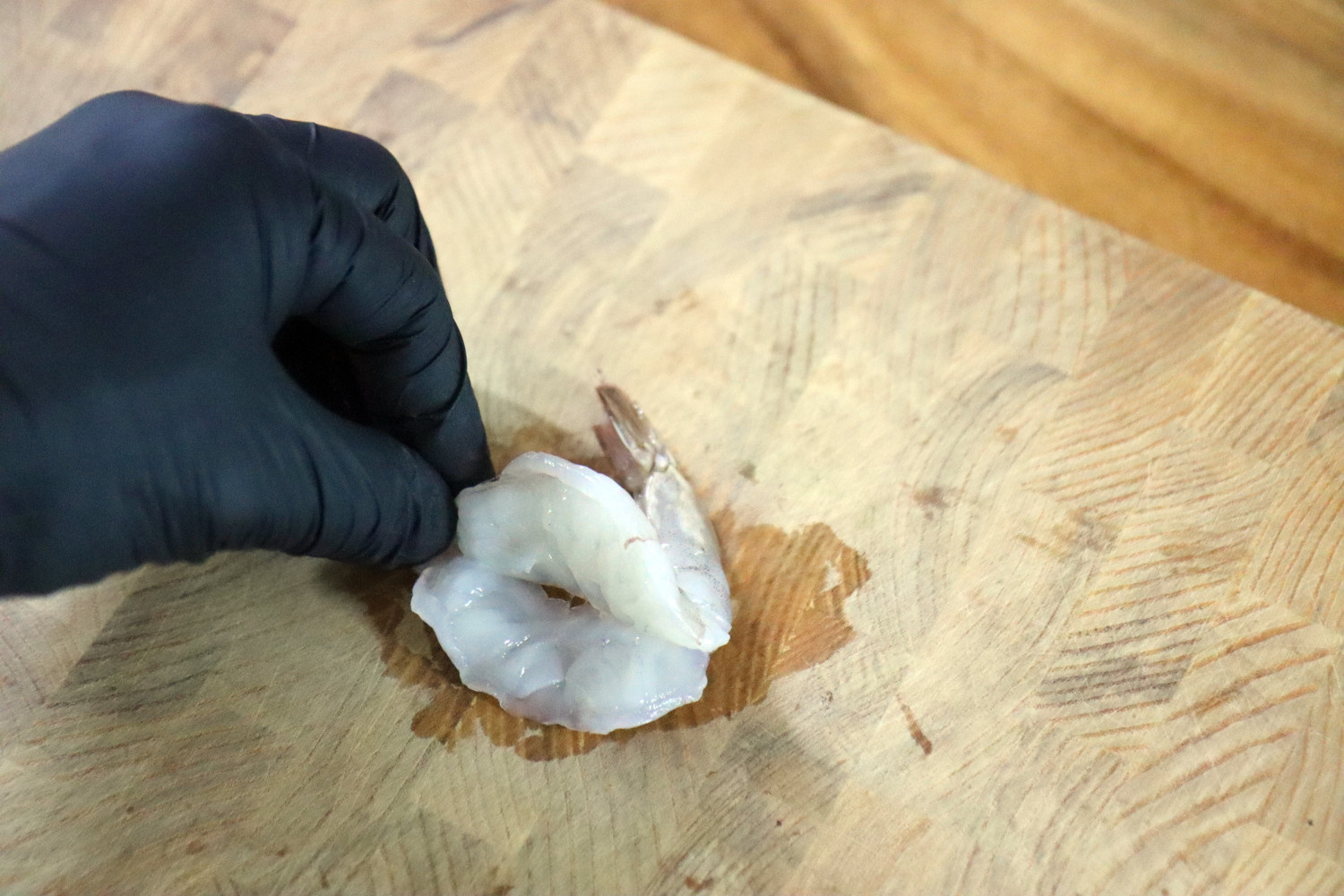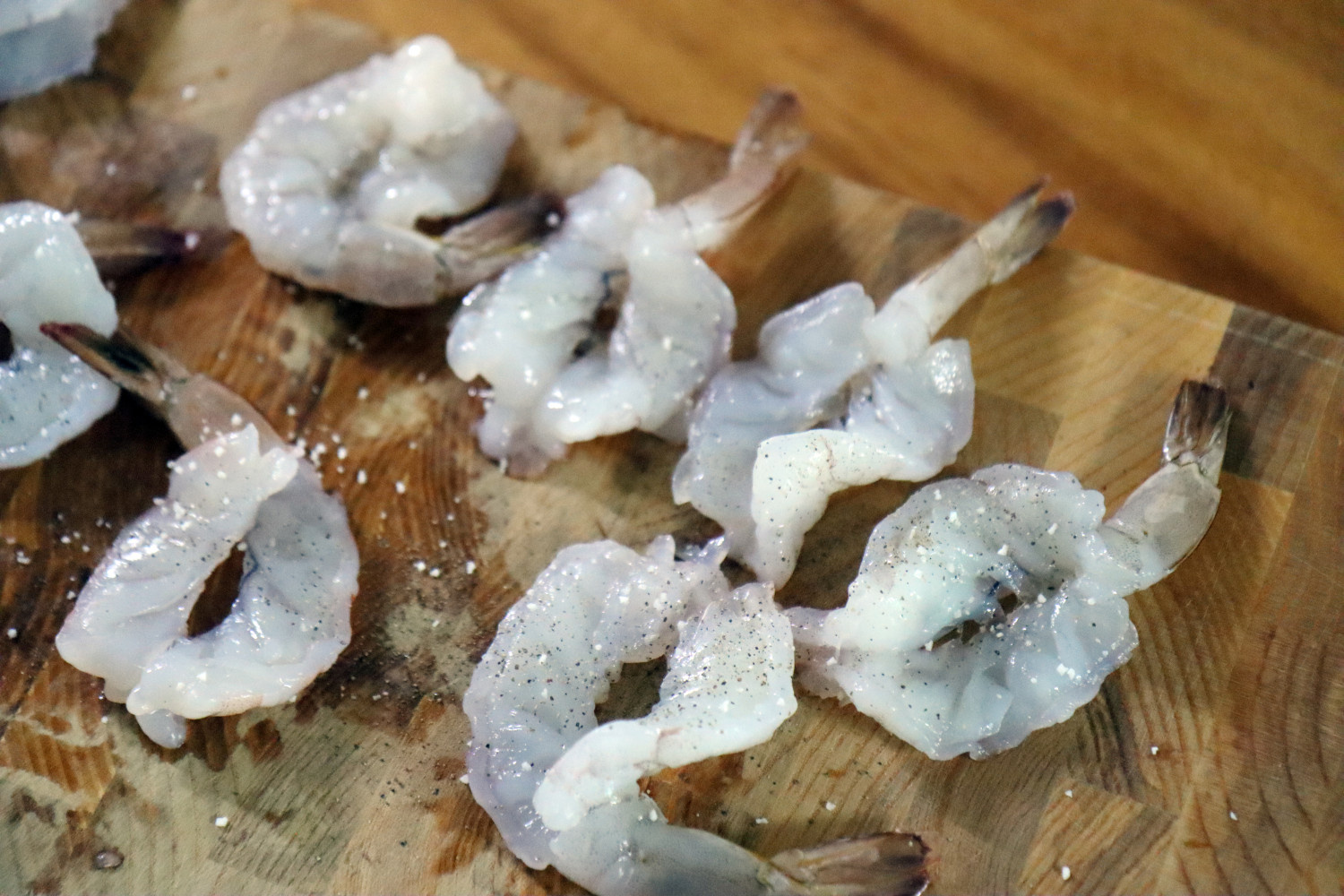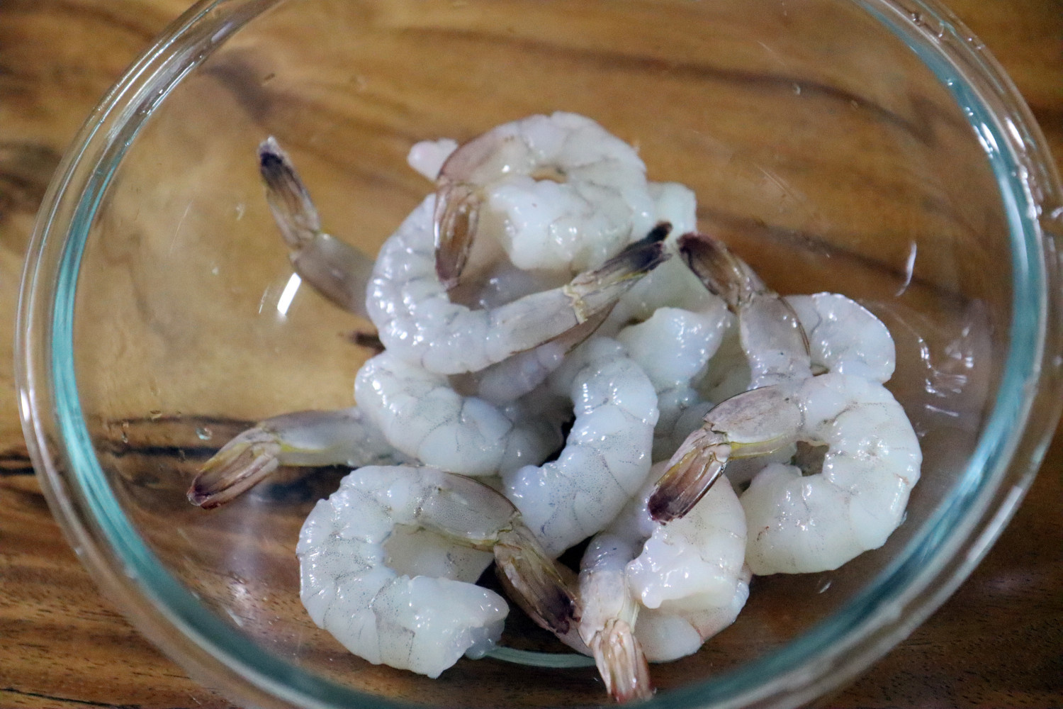 칵테일 새우 200 g , 소금 2 꼬집 , 후춧가루 2 꼬집 , 감자전분 3 숟가락