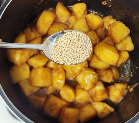 감자 3 개 , 물 250 ml , 진간장 12 T , 설탕 1 T , 맛술 1 T , 다진마늘 1 T , 올리고당 2 T , 참기름 1 T , 통깨 1 T