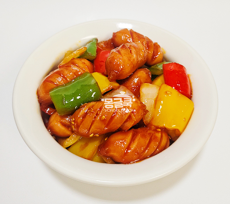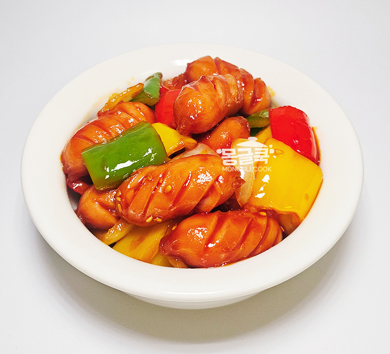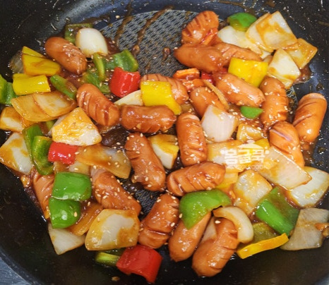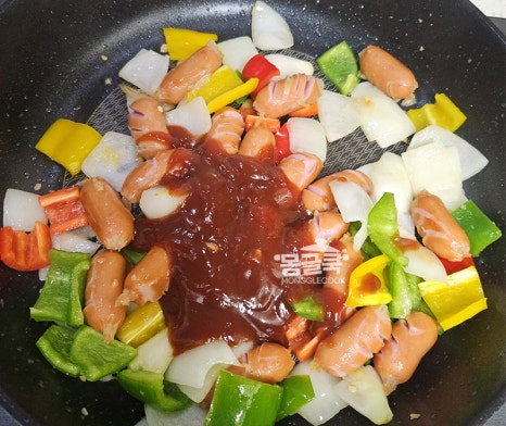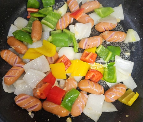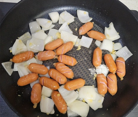 소시지를 넣고 칼집이 벌어질 때까지 노릇하게 볶아주세요.