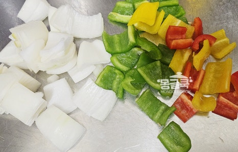 양파, 피망, 파프리카는 소시지와 비슷한 크기로 깍둑썰기해주세요.