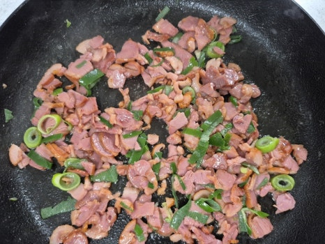 ✔️훈제오리를 가장 먼저 볶으면 그 기름으로 볶음밥을 만들 수 있어요.