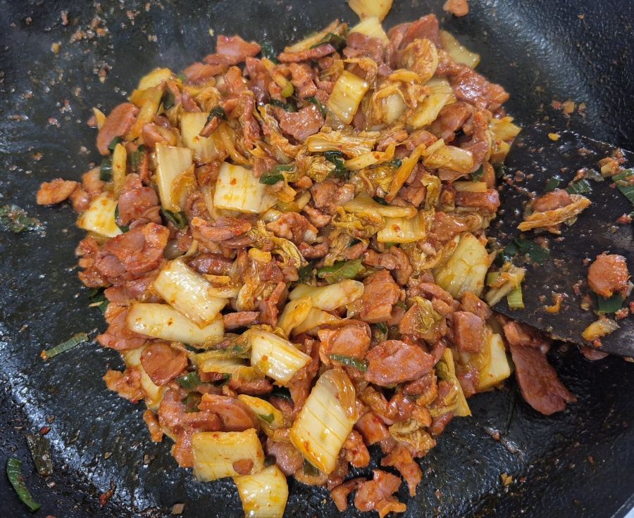 쫄깃쫄깃 짭조롬한 훈제오리에 매콤 아삭하게 씹히는 김치 듬뿍!