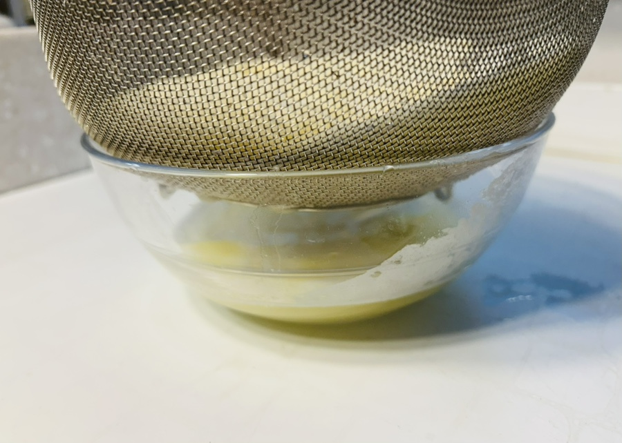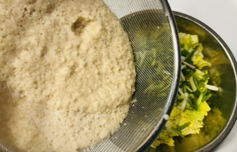 감자를 갈아서 체에 받쳐 감자물을 내려 받고 위에 감자 건더기는 충분히 물기를 빼고 따로 담아 놓아요.