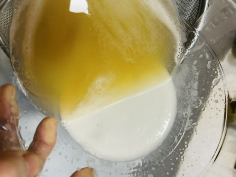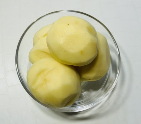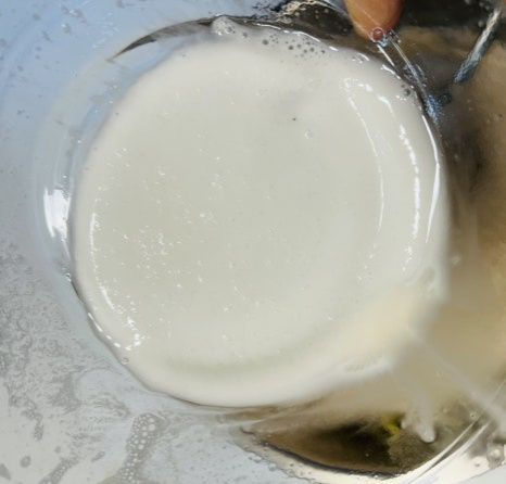 감자물을 받아서 5-10분 정도 놔두면 하얀 감자 전분이 가라 앉아요.