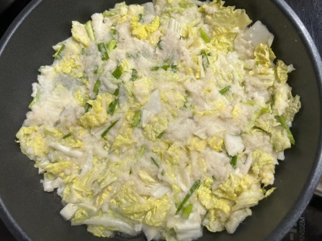 배추를 썰어서 감자 반죽과 섞어서 오일 두른 후라이팬에 촤악 펼쳐 앞뒤로 노릇노릇 부쳐주면 배추의 달큰함과 감자의 쫀득함이 고소함과 뒤엉켜서 푸짐한 배추감자전이 되요.