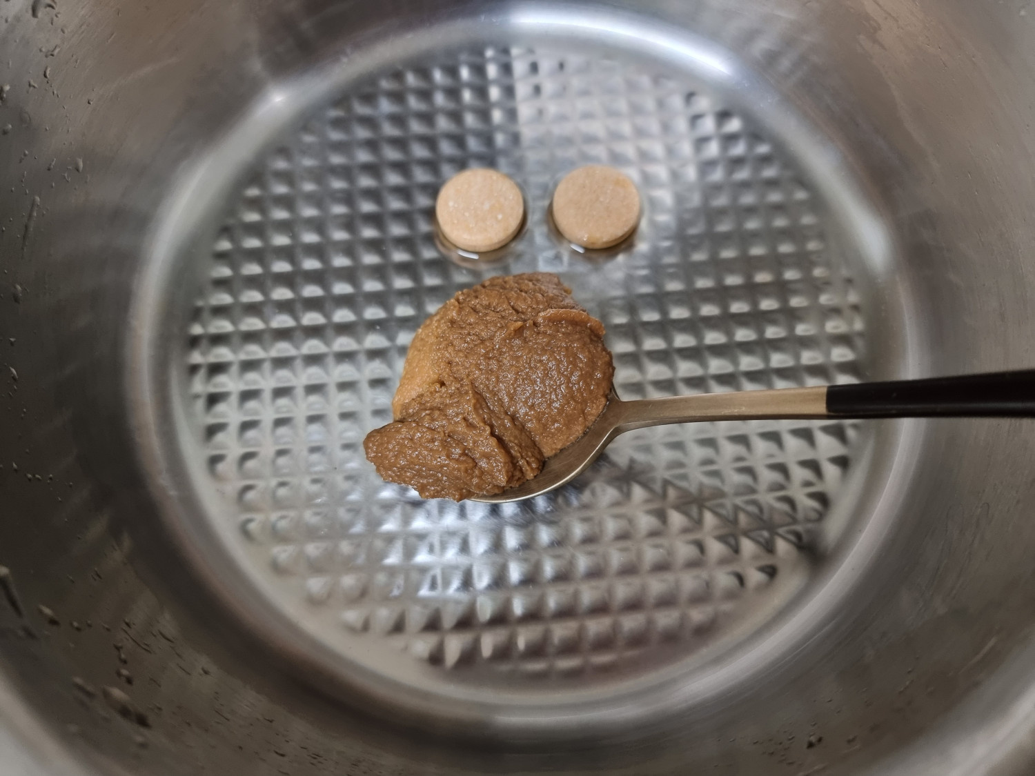 *육수가 끓으면 불을 낮추고 미소된장을 풀어 주세요.