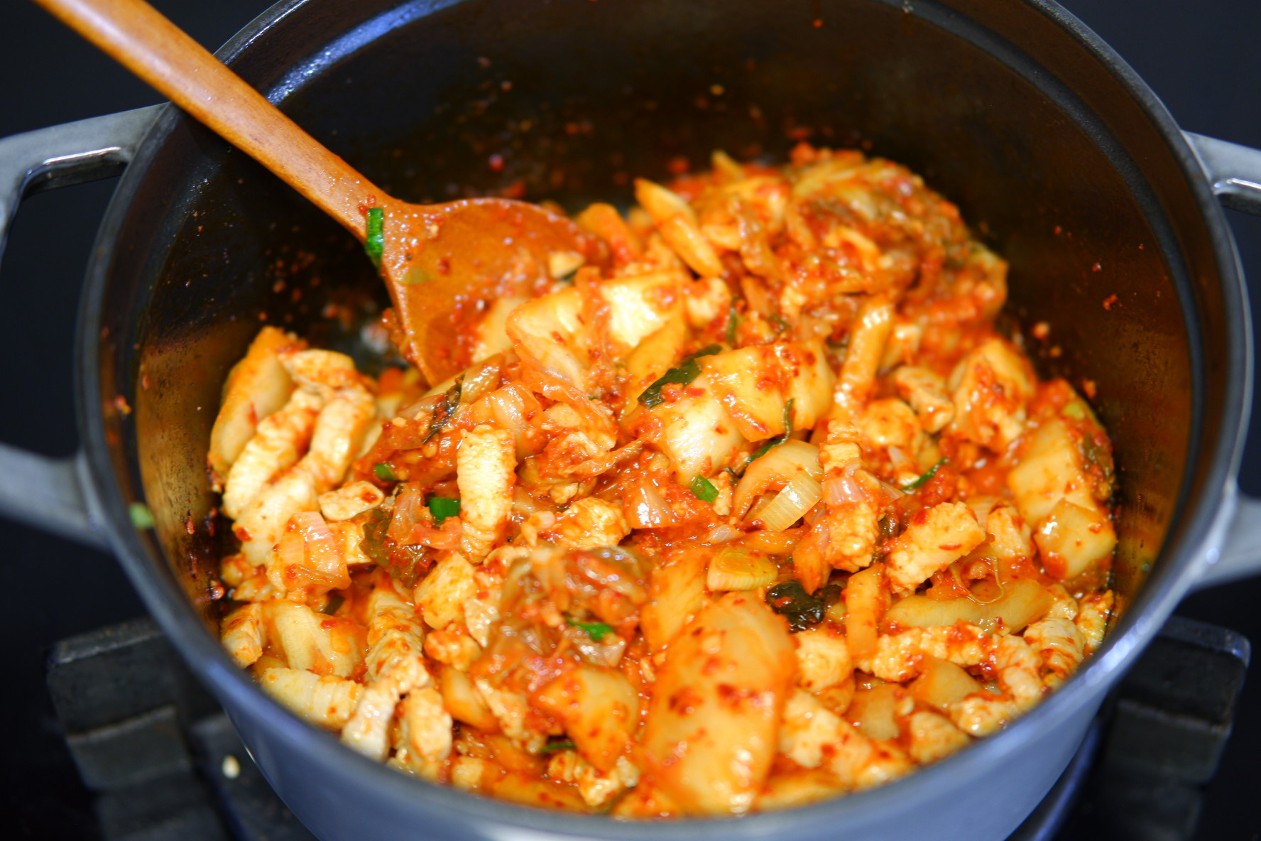 돼지고기의 기름진 풍미와 김치의 산미가 어우러져