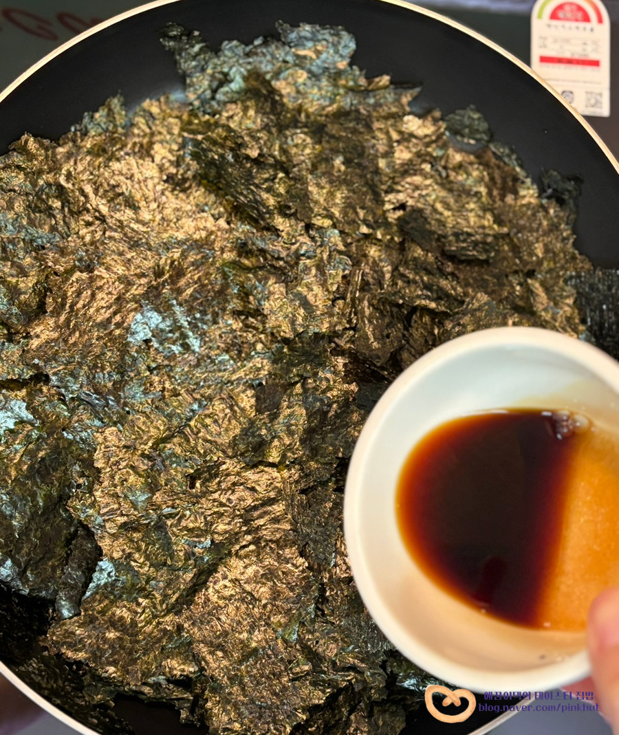 프라이팬에 바삭하게 볶아주기만 하면 되는데요. 간장, 맛술, 설탕, 참기름 골고루 섞은 양념장 끼얹어 볶아주면 초간단 김자반 만들기가 완성돼요.