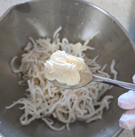 진미채를 양념에 넣기 전에 마요네즈를 한 번 코팅해 주는 거예요. 그러면 마요네즈의 유지방이 진미채 사이사이에 스며들어서 수분을 꽉 잡아주거든요. 냉장고에 일주일을 둬도 절대 딱딱해지지 않아요. 이건 정말 꿀팁 중의 꿀팁이니까 꼭 기억하세요!