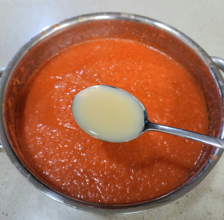 8. 큰 냄비에 갈아둔 토마토만~먼저 담고 끓이기. (강불. 5분 정도)