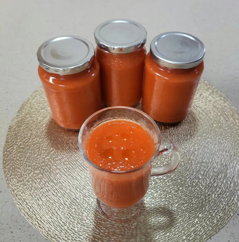 16. 토마토. 당근 스무디 완성. 병에 담아 냉장 보관. 1주일 정도 보관 가능.