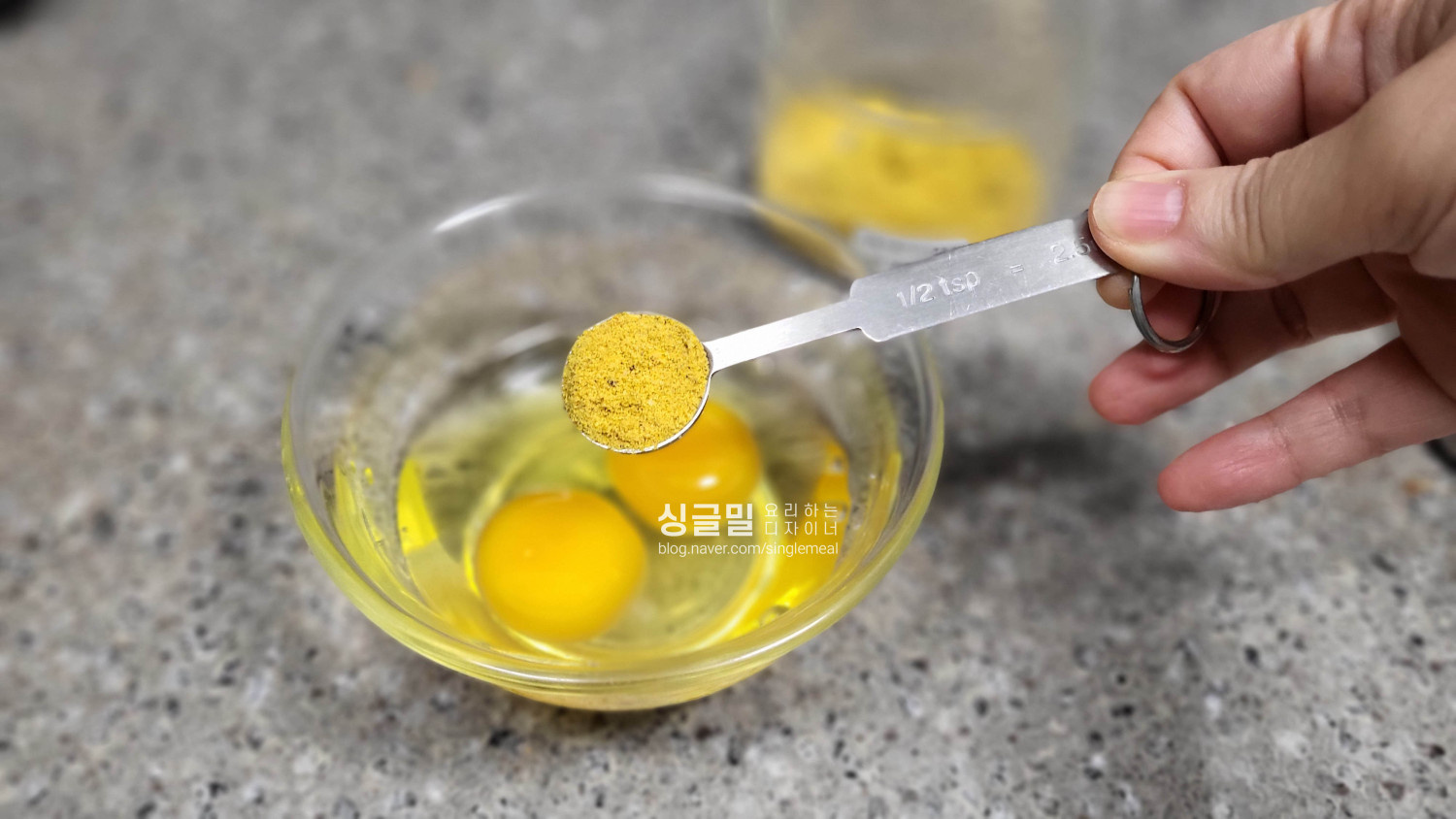 볼에 계란 2개 톡 깨넣고, 카레가루와 맛술을 넣고 잘 섞어준다.