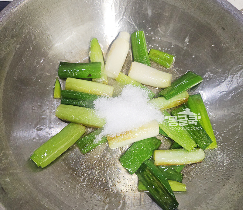 설탕 2큰술을 먼저 넣고 대파와 함께 살짝 볶아 단맛과 풍미를 더해주세요.