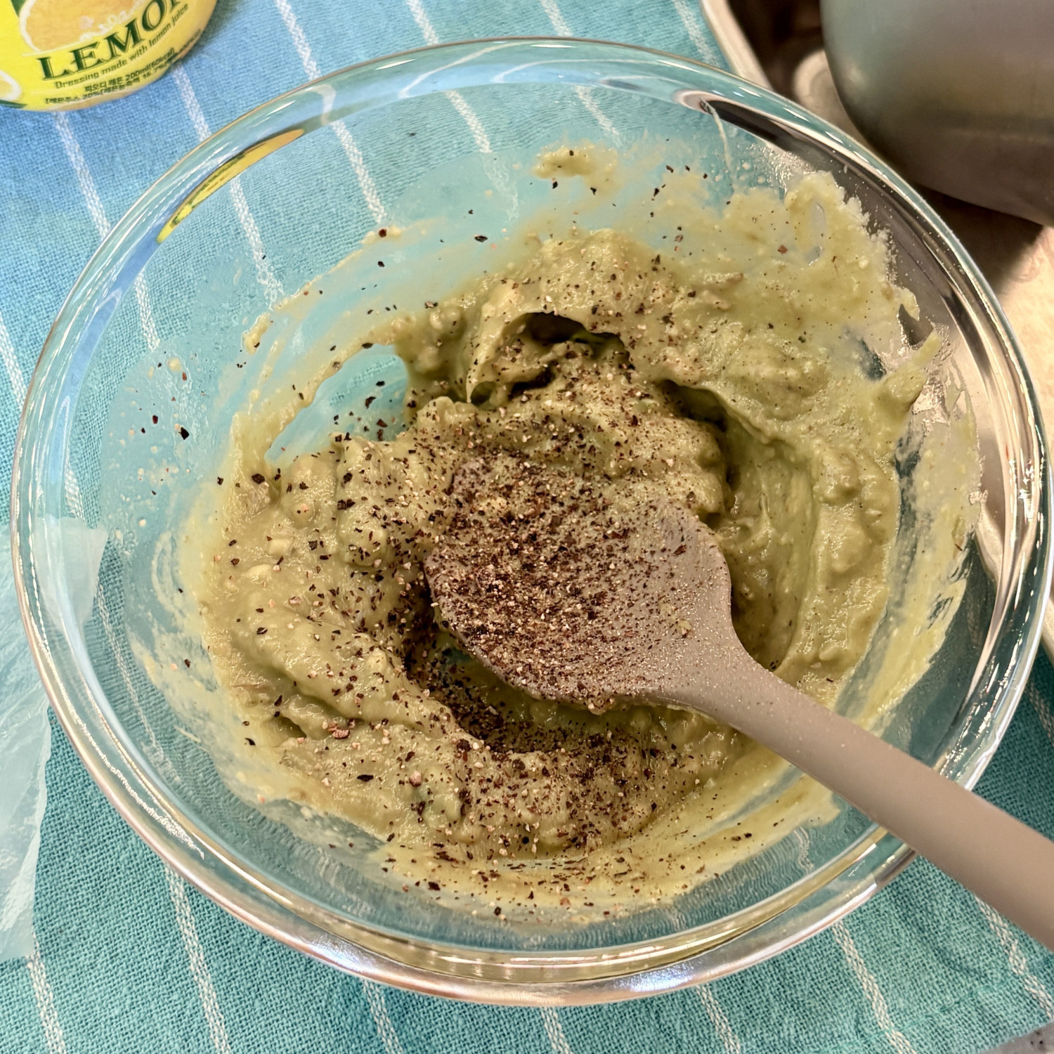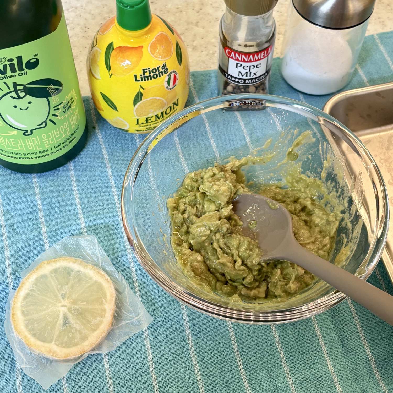 엑스트라 버진 올리브오일과 소금, 후추, 레몬즙, 마늘 등을 넣어 아보카도 페이스트를 만들 거예요.