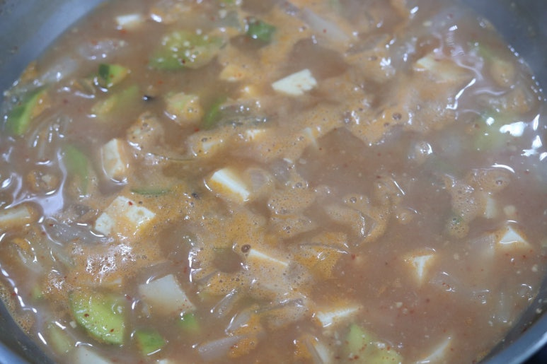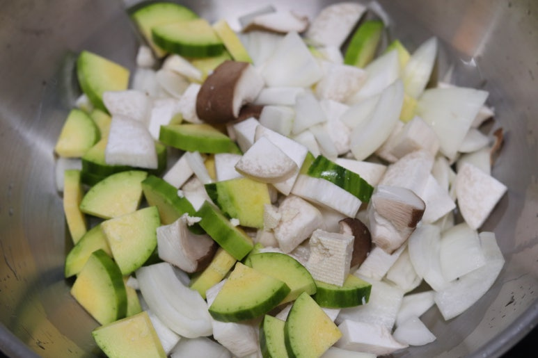 애호박 1/2개 , 새송이 버섯 1개 , 양파 1개 , 두부 1/2모 , 물 1리터 , 코인 육수 3개 , 된장 2스푼 , 고춧가루 1스푼