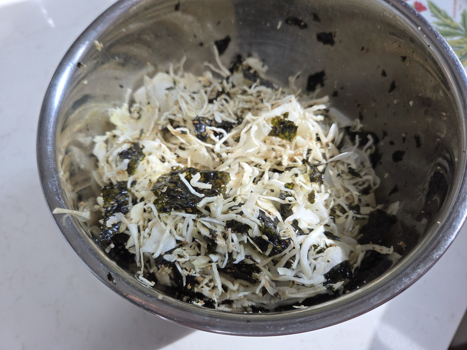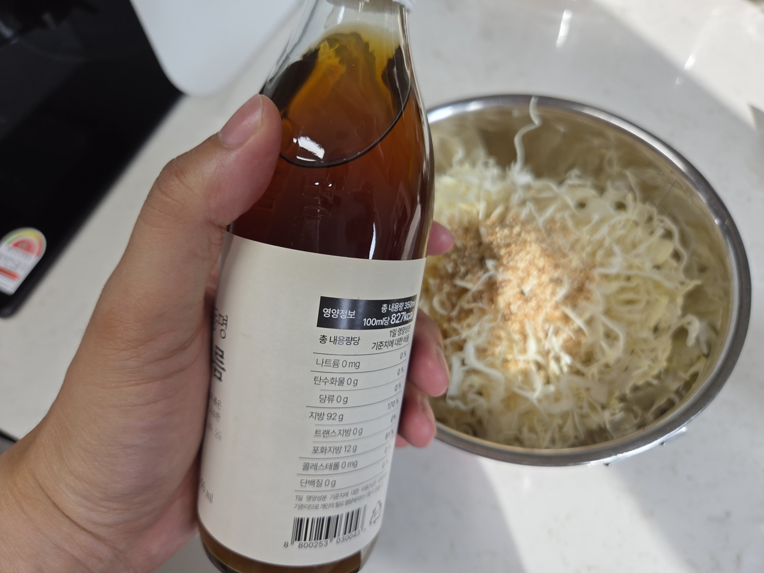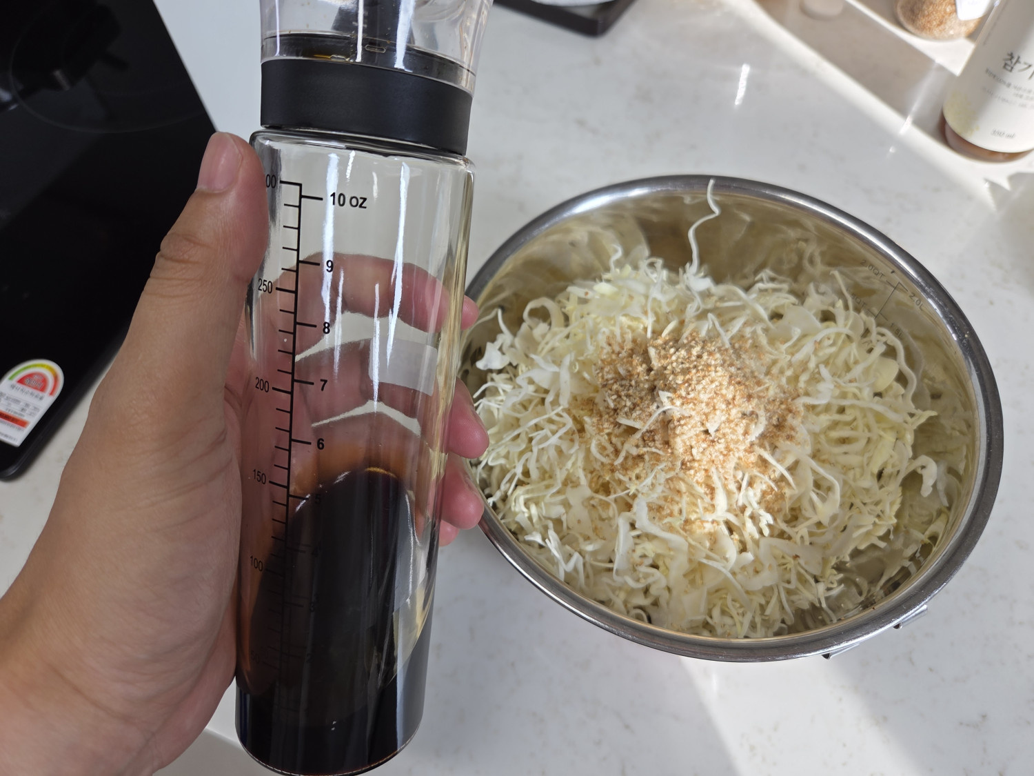 양배추 220 g , 도시락김 2 봉 , 간장 1 T , 참기름 2.5 T , 깨소금 2 T