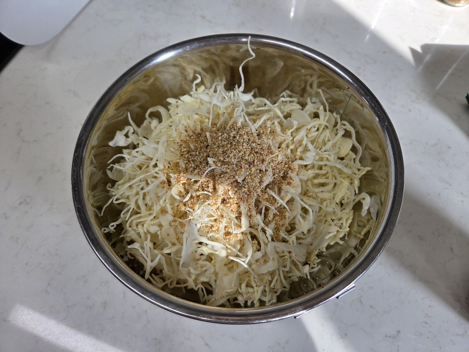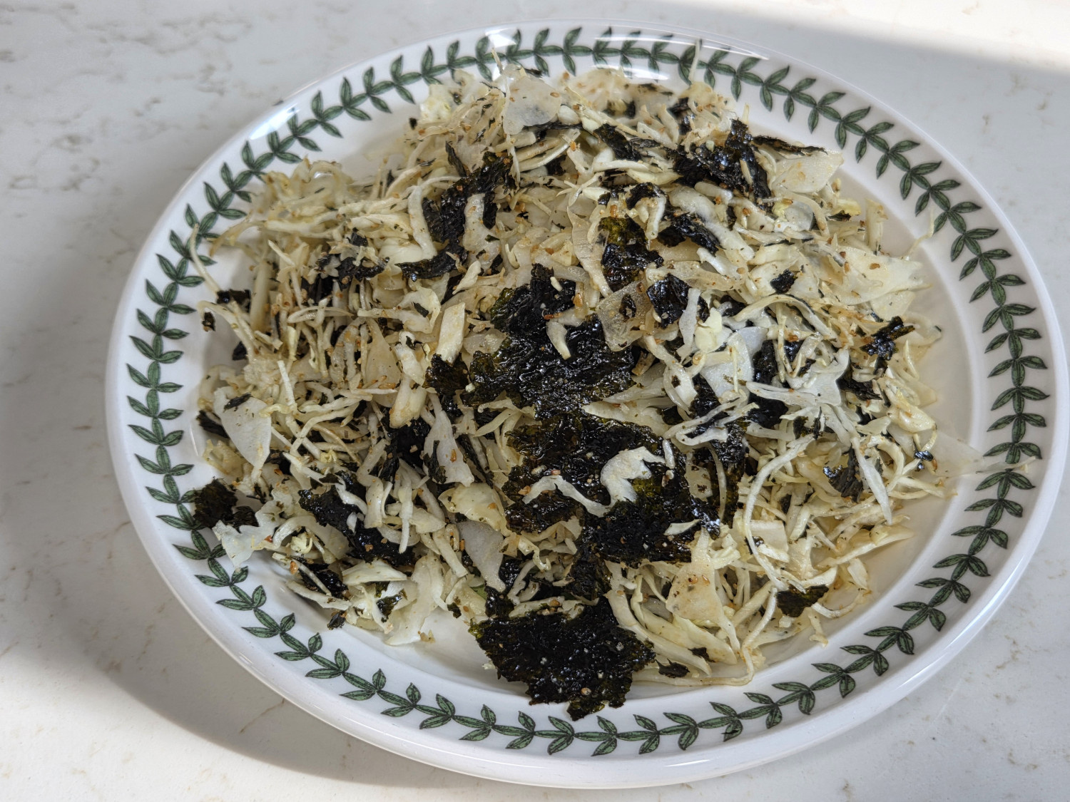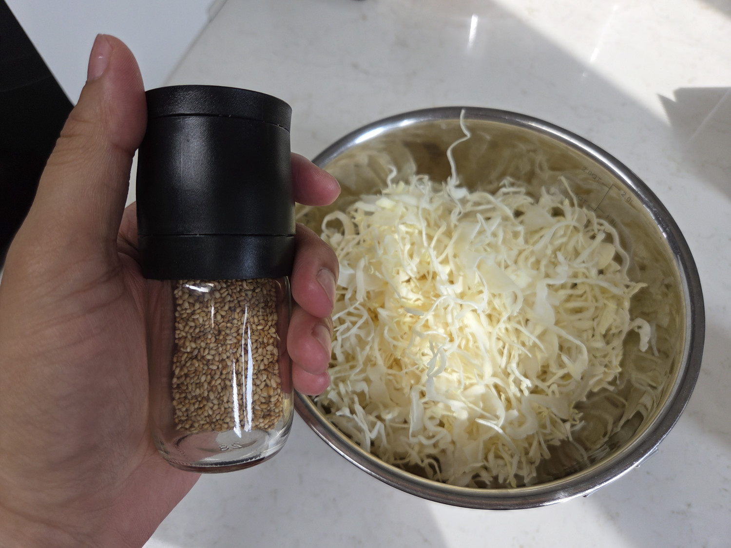 양배추 220 g , 도시락김 2 봉 , 간장 1 T , 참기름 2.5 T , 깨소금 2 T