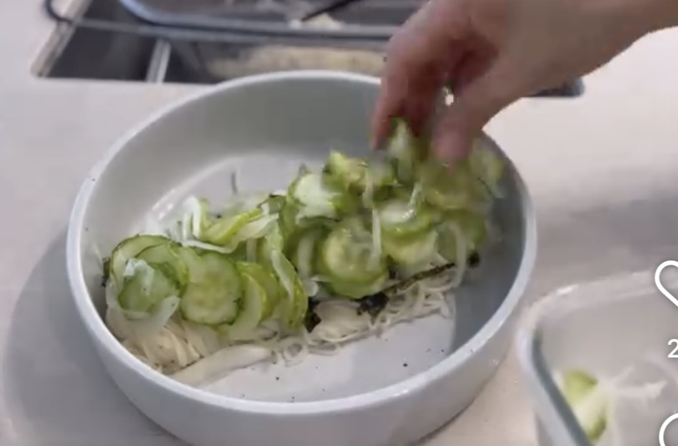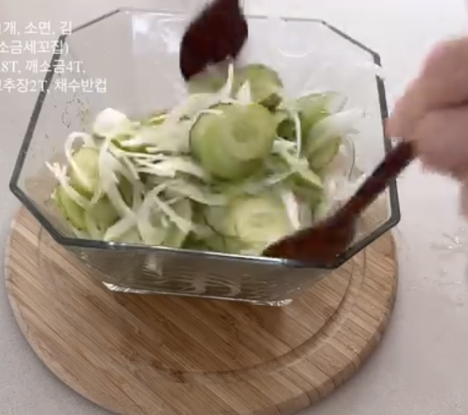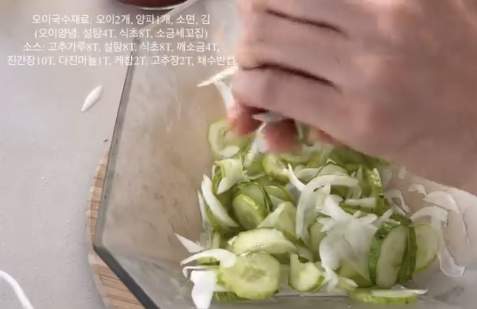 오이 2 개 , 양파 1 개 , 소면 2 줌 , 조미김 1 통