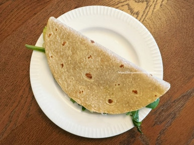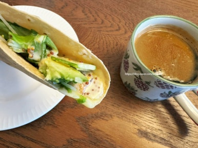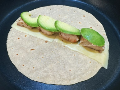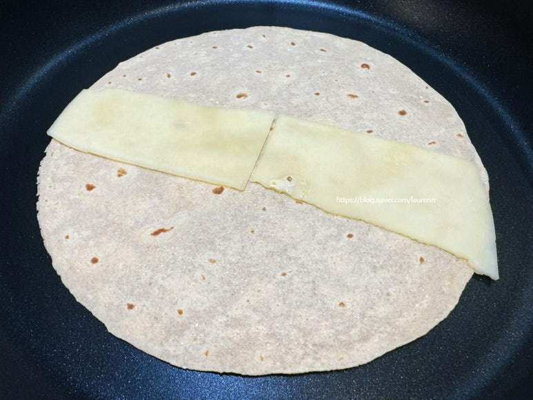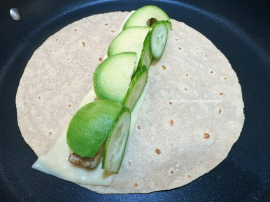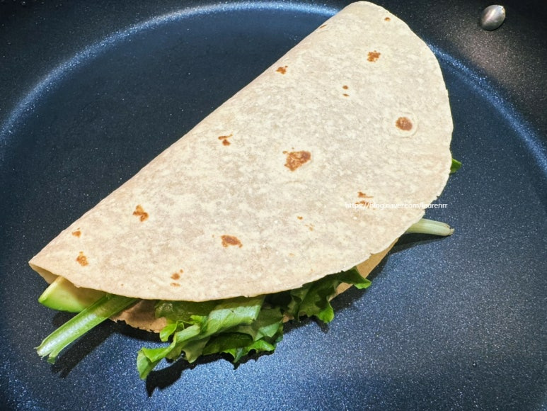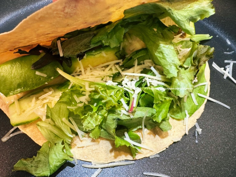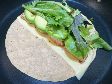 또띠아 1장 , 구다치즈 1장 , 그릴드 치킨 적당히 , 아보카도 1/4개 , 오이 조금 , 어쏠티드 샐러드 채소 적당히 , 그라나 파다노 치즈 듬뿍