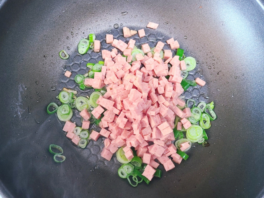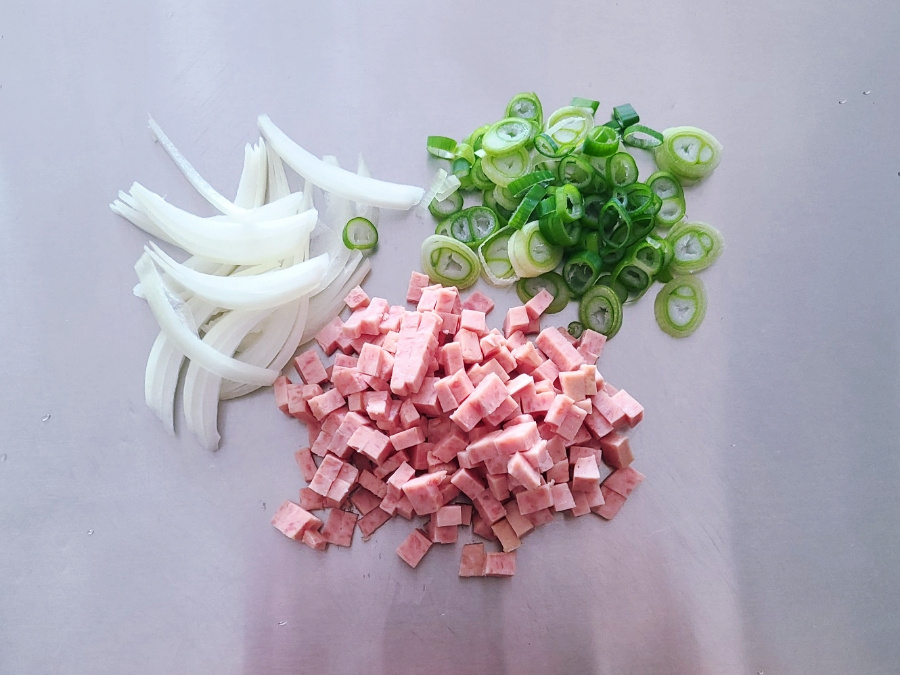 스팸은 5mm 정도 크기로 네모 썰고, 양파는 얇게 채 썰고, 대파는 송송 썰어서 준비하면 되세요.