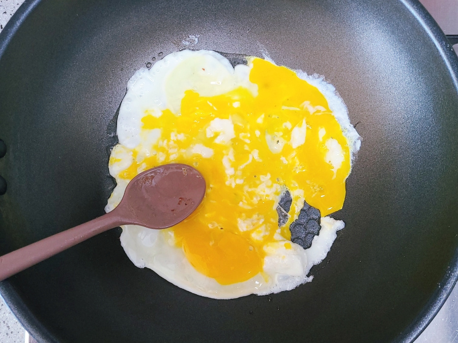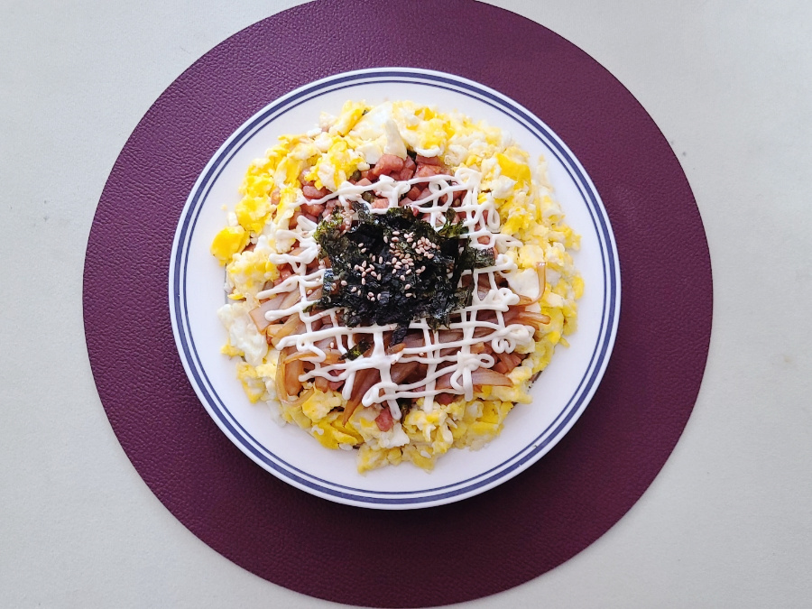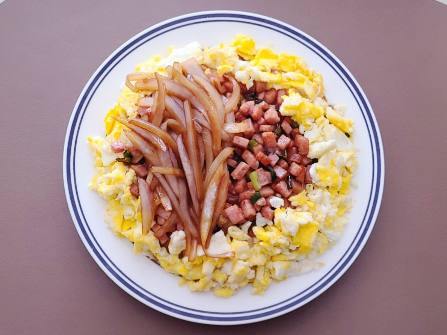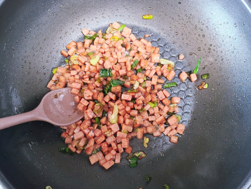 스팸을 넣은 다음에 노릇노릇해질 정도로 볶아주다가 가스불을 끄고, 볶음 재료들은 다른 그릇에 덜어 놓고 스크램블 에그를 만들면 되세요.