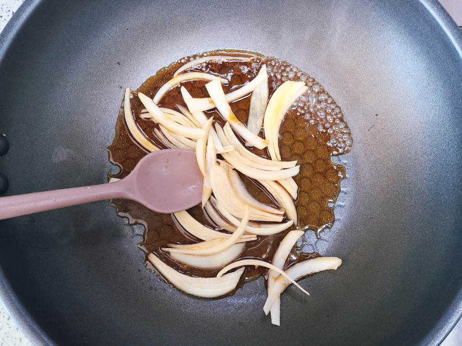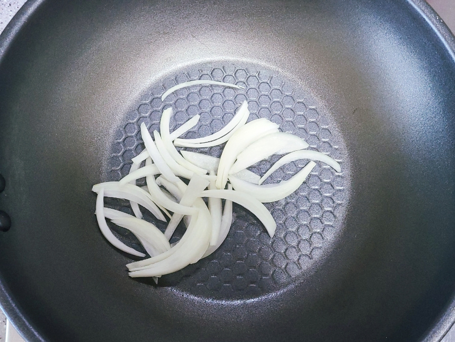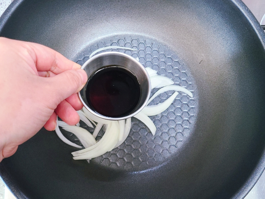 스크램블 다른 곳에 옮겨 놓고 닦은 다음에 채 썬 양파와 진간장 1큰술, 맛술 미림 0.5큰술, 물 3큰술을 넣고