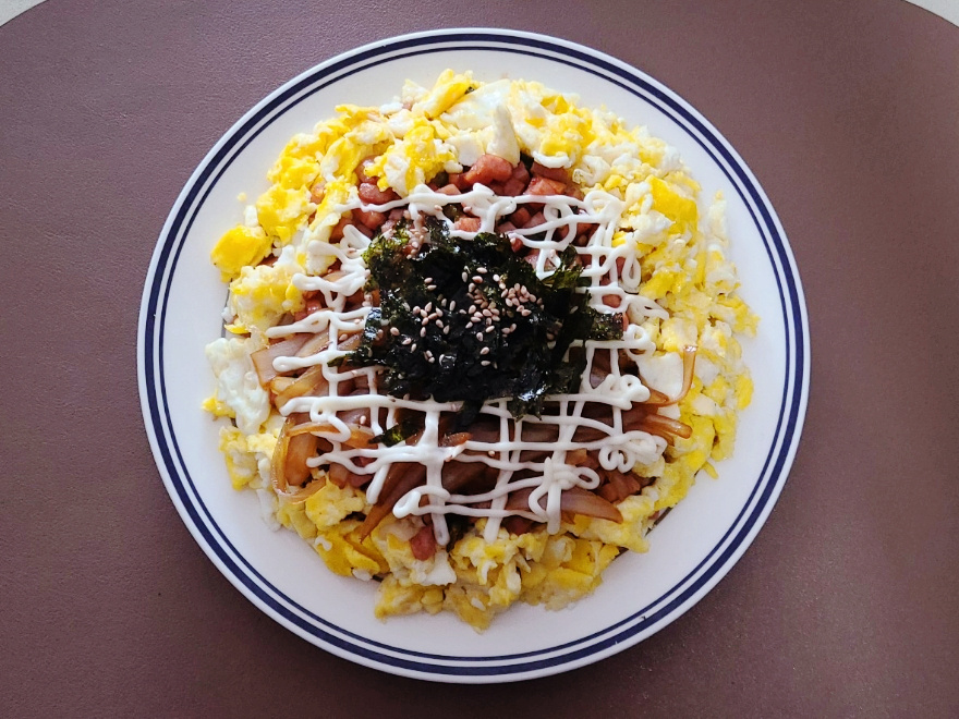 스팸마요덮밥 양파간장 소스는 스팸을 한쪽으로 밀어 놓은 다음에 옆쪽으로 간장소스를 올려주고