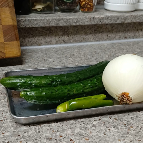 오이 2개 , 양파 1/2개 , 청양고추 1~2개 , 물 800ml , 소금 1.2숟가락 , 설탕 4.5숟가락 , 식초 8숟가락 , 통깨 듬뿍 , 각 얼음