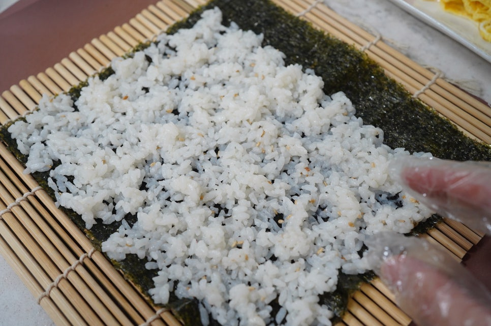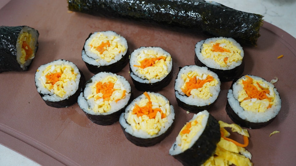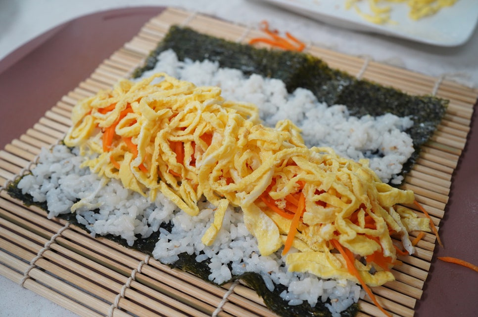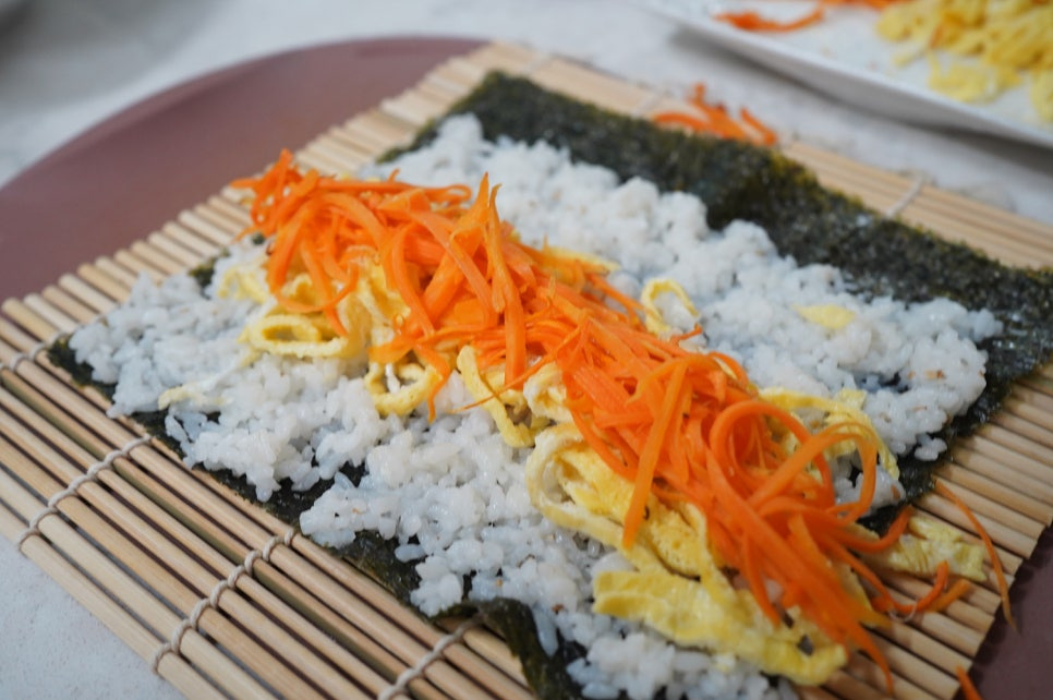 김밥김 2장 , 밥 1.5공기 , 당근 1개(맛소금 1꼬집) , 계란 3개(맛소금 2꼬집) , 식용유 약간