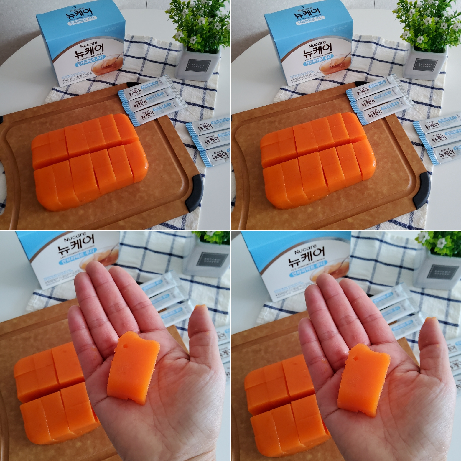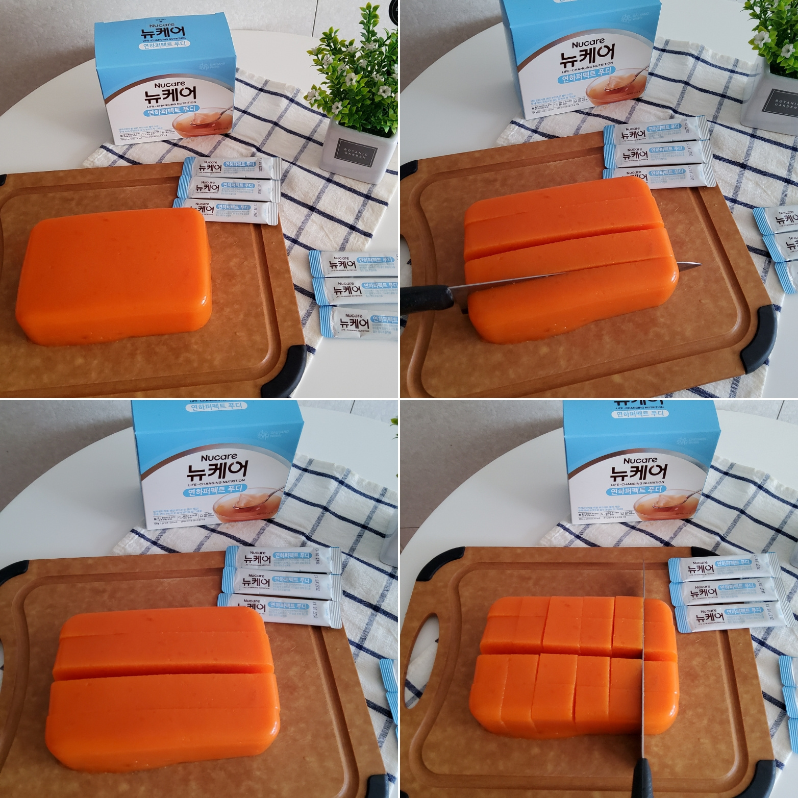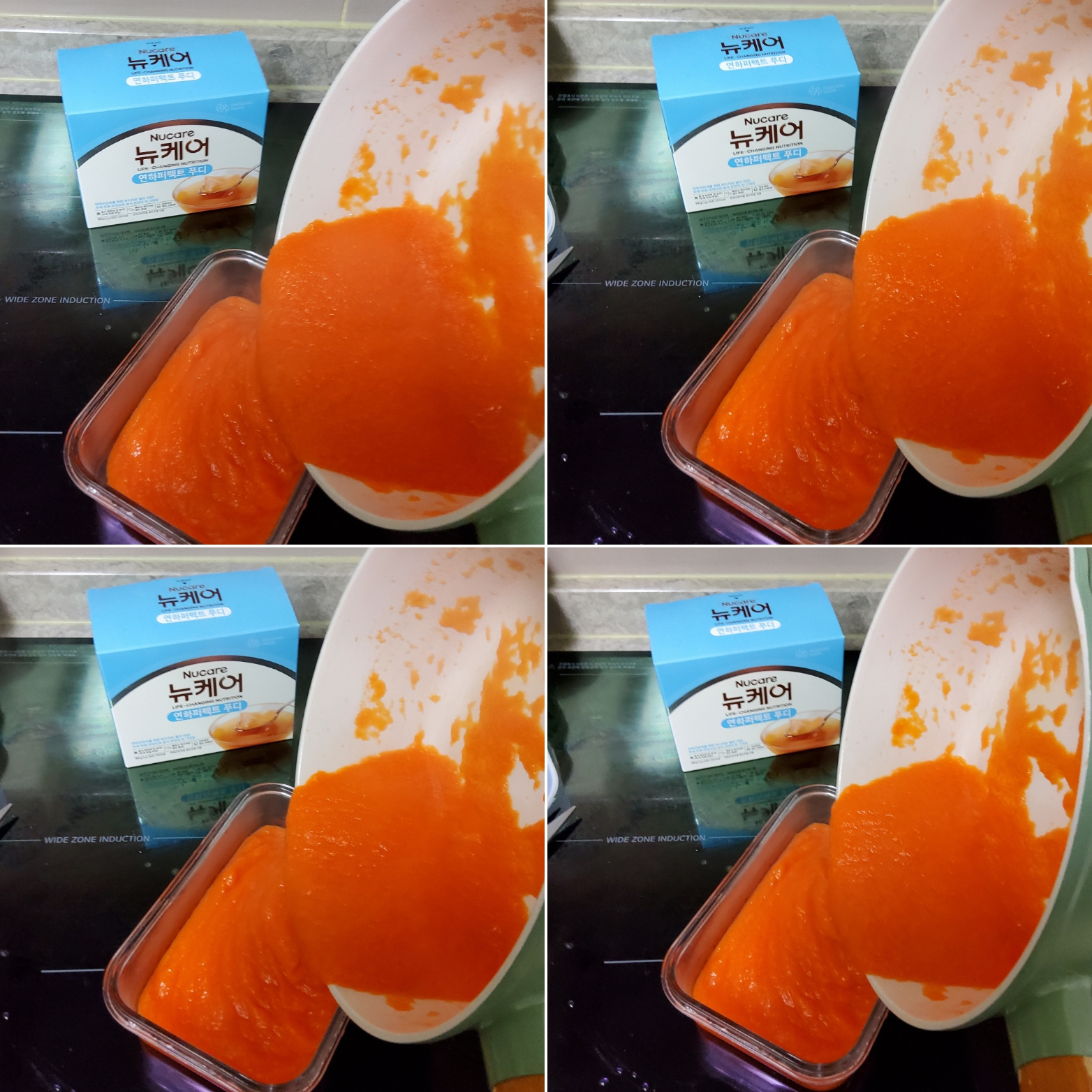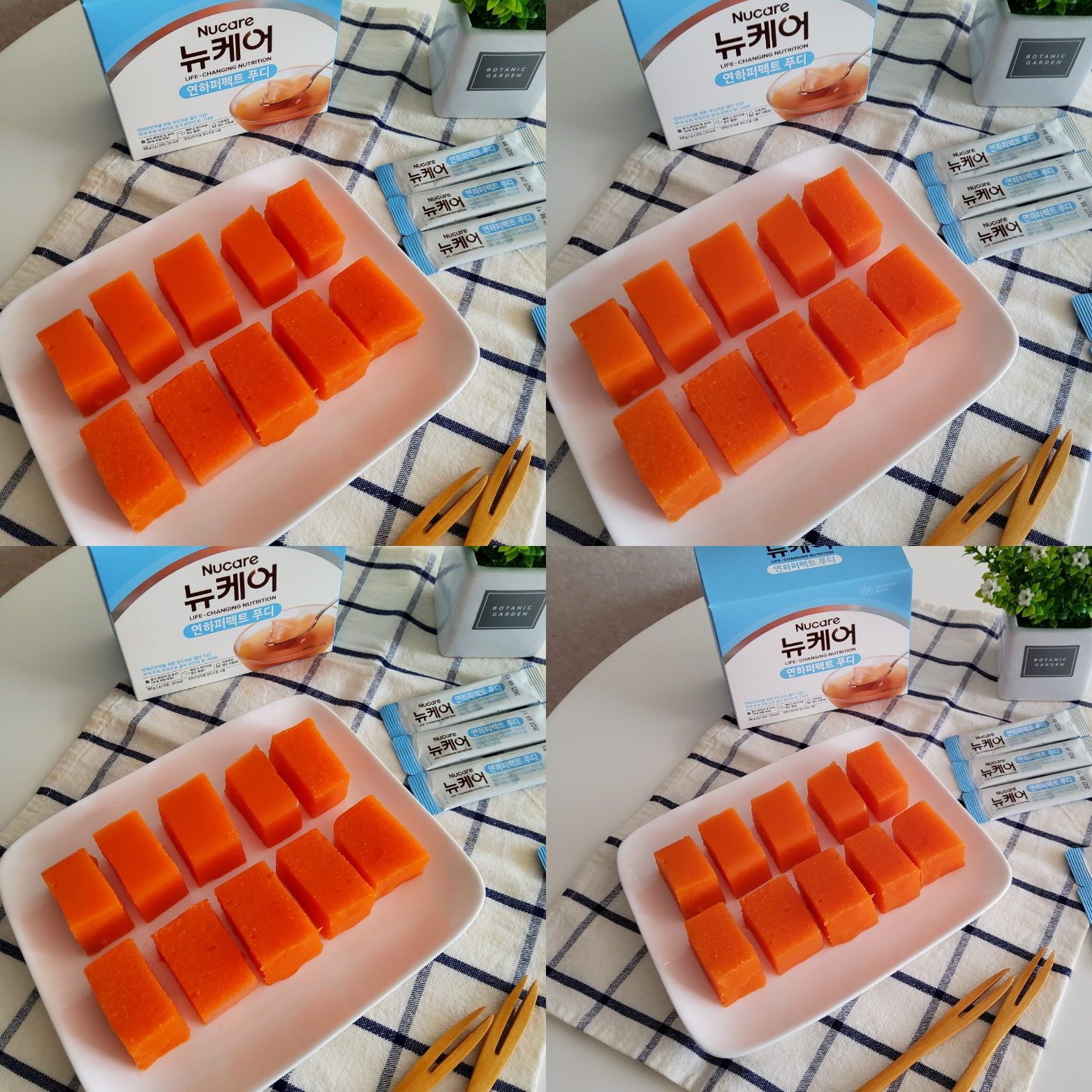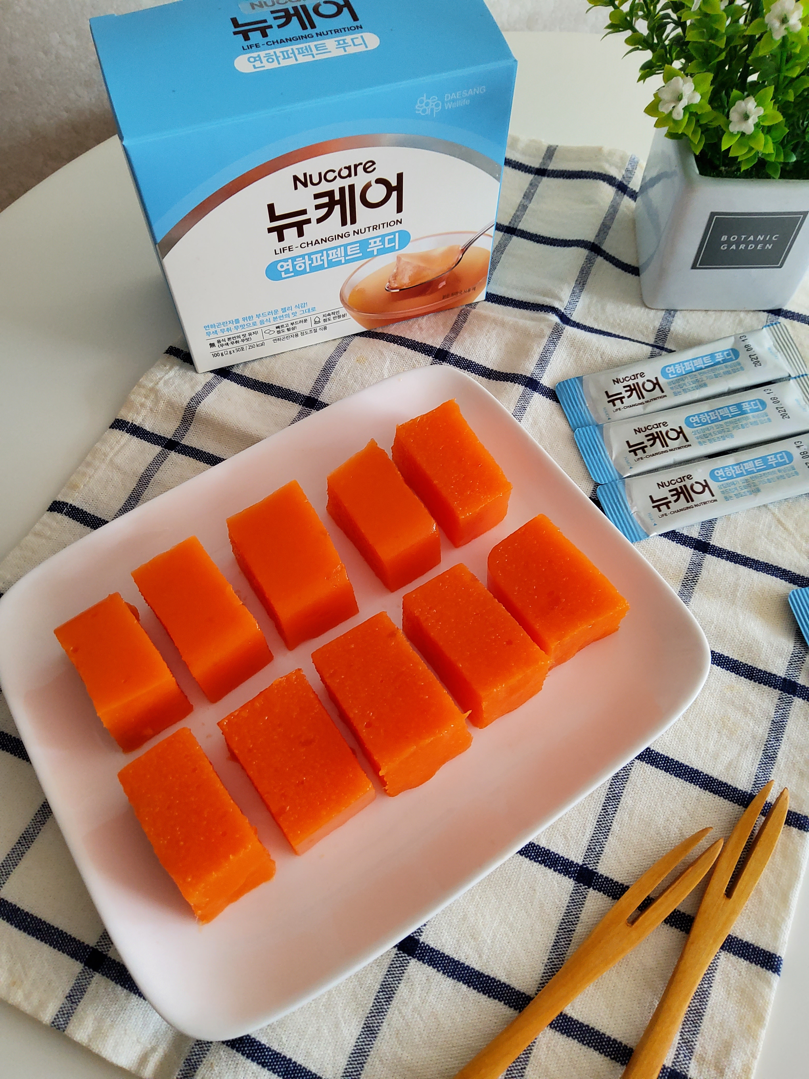연하퍼펙트 푸디를 활용하는 나만의 요리중에 겨울철에 더 맛있는 당근으로 당근을 살짝 삶아준후 곱게 믹서기에 갈아서 연하퍼펙트 푸디를 넣어서 묵처럼 냉장고에 50분정도 넣어두었다가 꺼내서 먹기좋은 크기로 잘라서 간식으로도 먹을수 있는 당근젤리는 연하곤란자에게 맛있는 요리를 선물하고 싶은 소박한 마음으로 만들게 되었습니다. 연하곤란자여러분 모두모두 힘내세요.