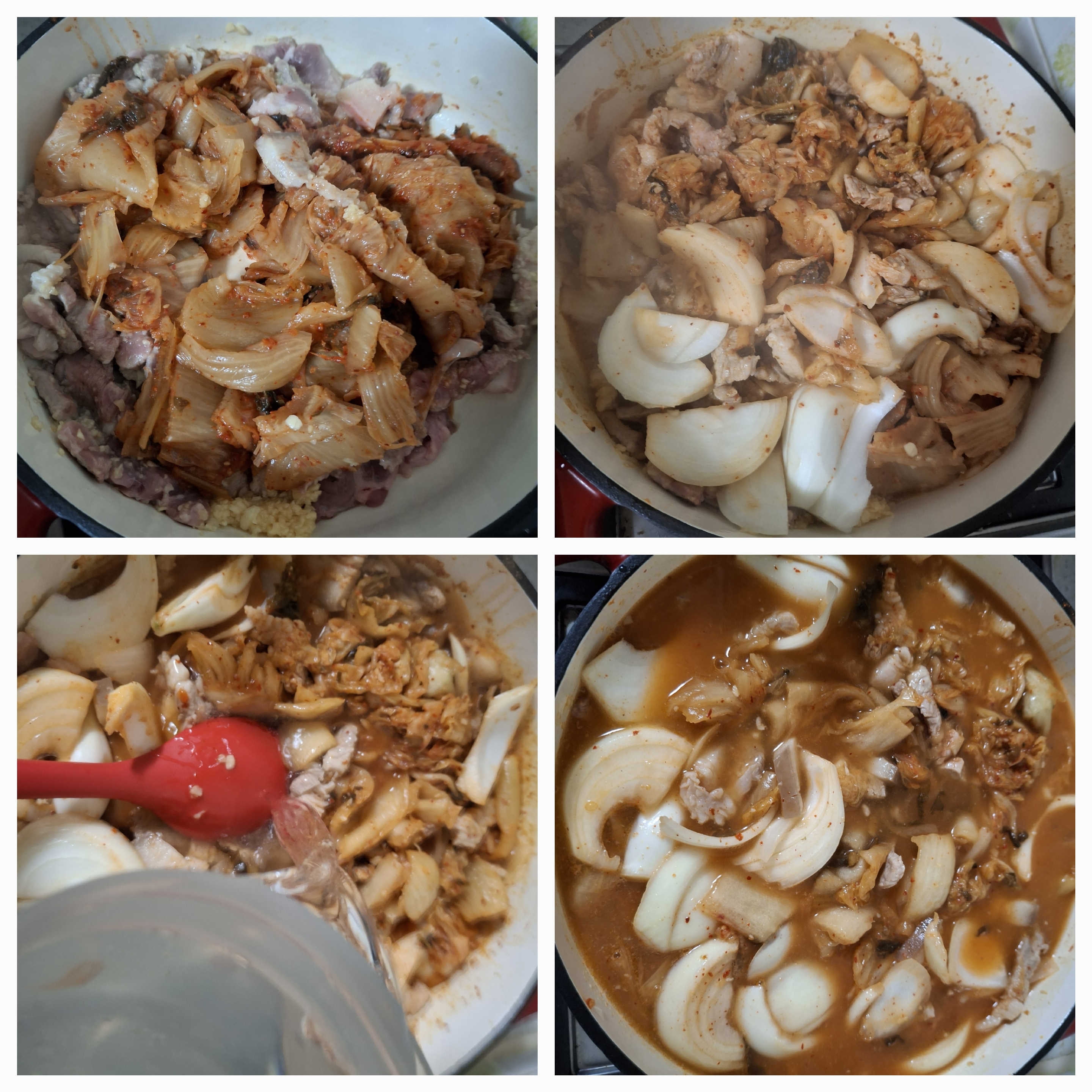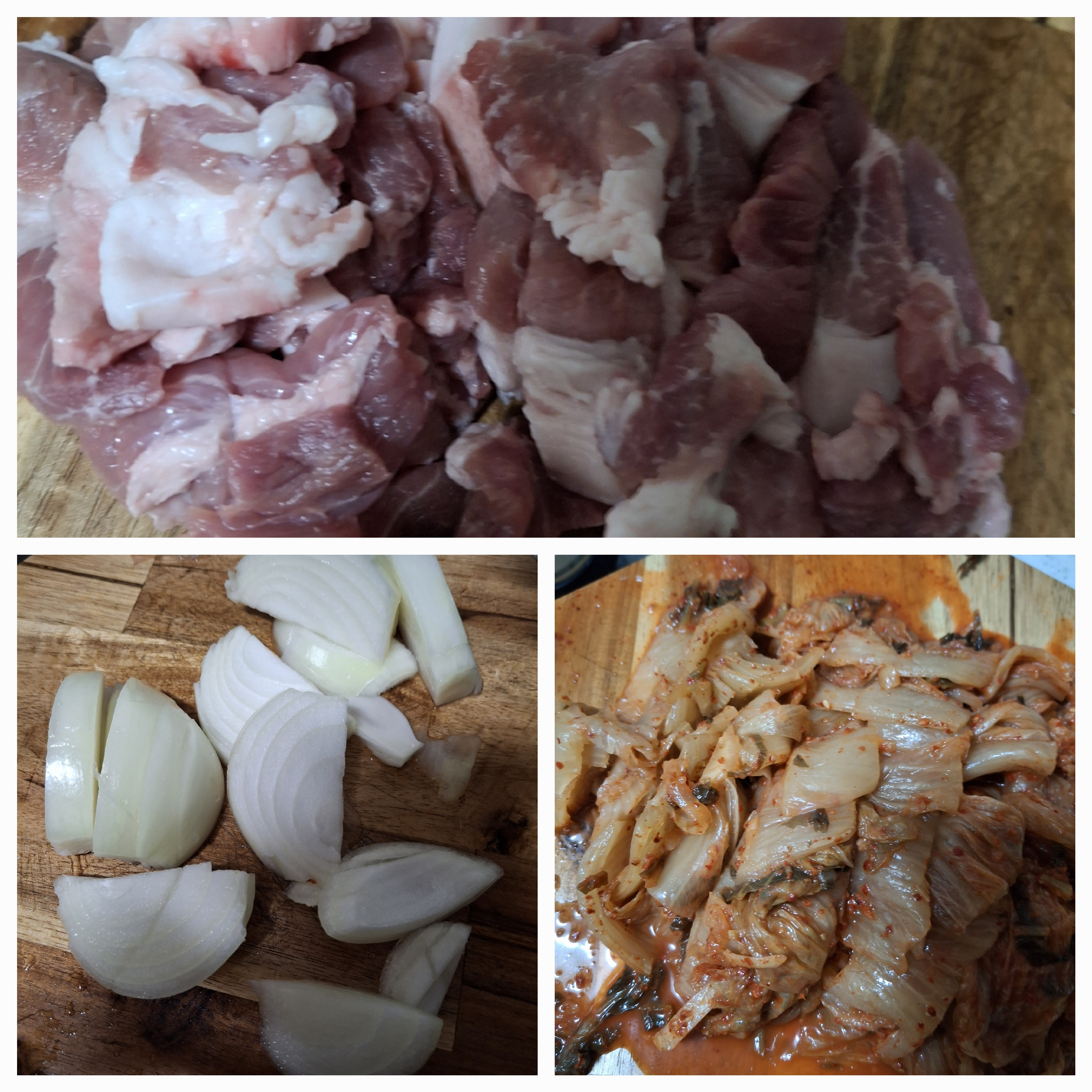 돼지고기 300g , 묵은지 200g , 양파 1개 , 두부 1모 , 마늘 2스푼 , 대파 1대 , 고추가루 2스푼 , 액젓 1스푼