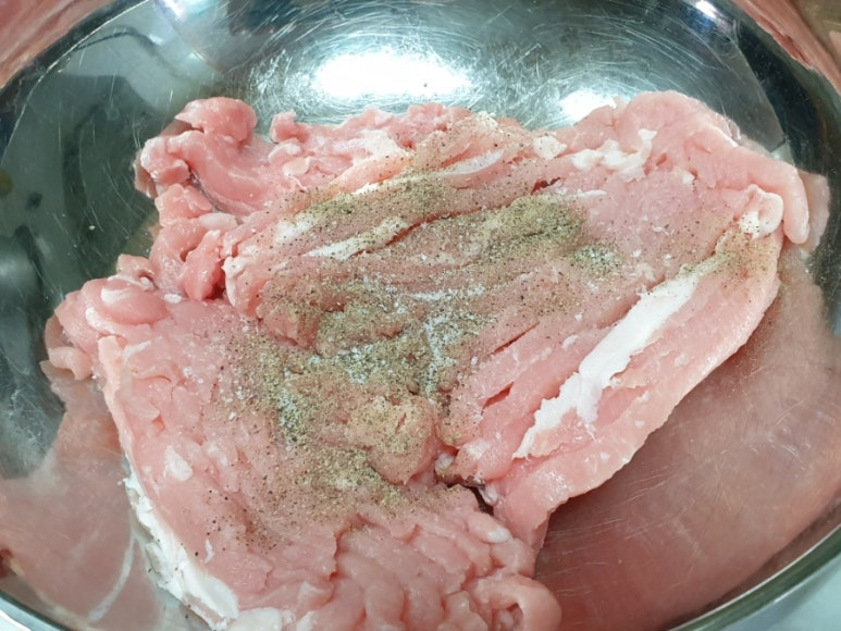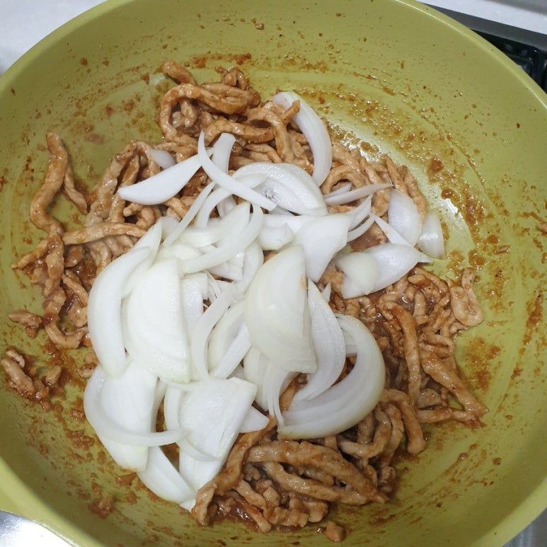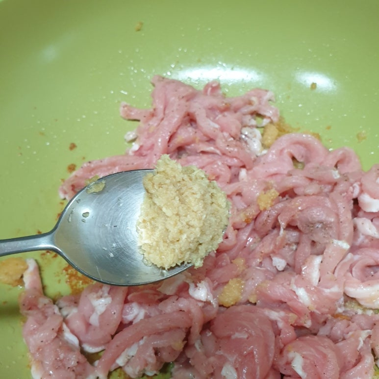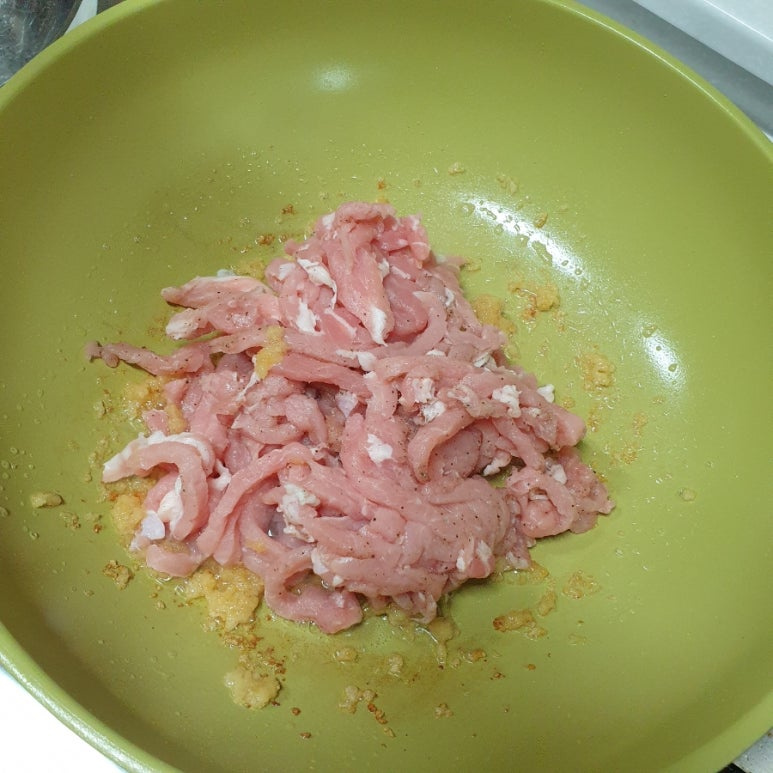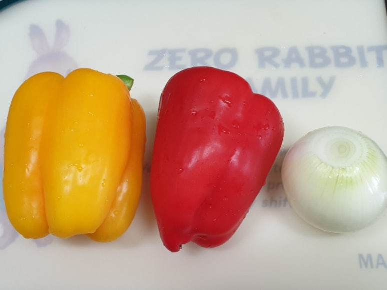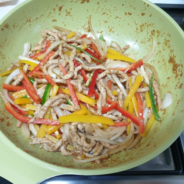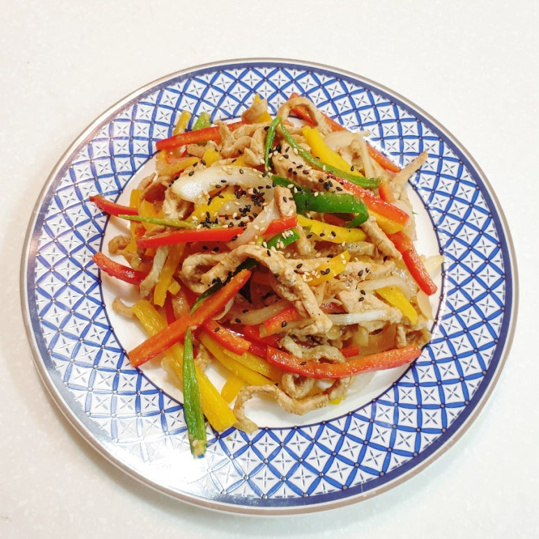 돼지고기 잡채용 300g , 피망 1개 , 파프리카 2개 , 양파 반개 , 다진 생강 조금