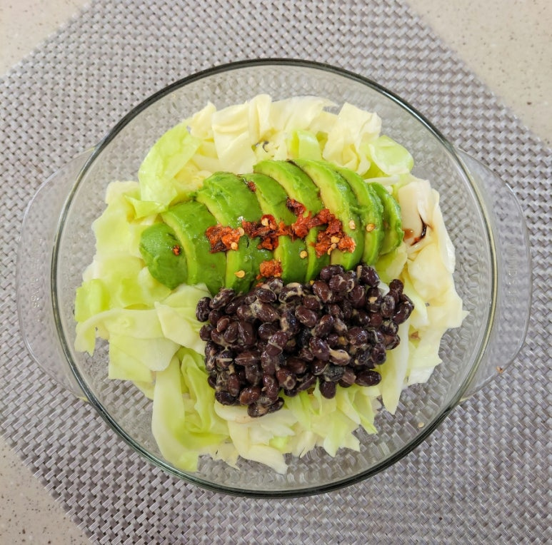 10. 총 3분(전자레인지로 ) 가열한 양배추는 아삭하게 적당히 잘 익은 상태. 우선 아보카도 반 개 썰어서 올리기. (맨 아래는 퀴노아.닭가슴살 밥이 든든하게 숨어 있음~!)