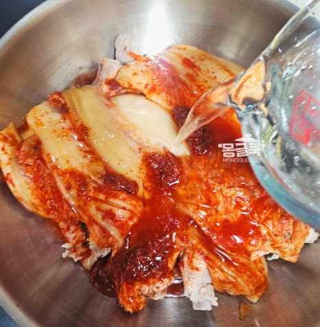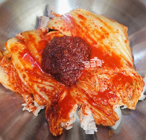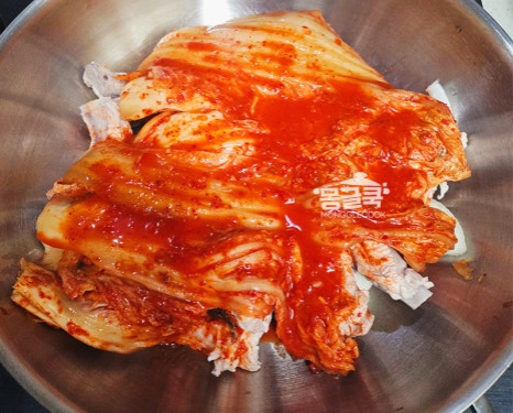 만든 양념장을 김치 위에 골고루 올려주세요.