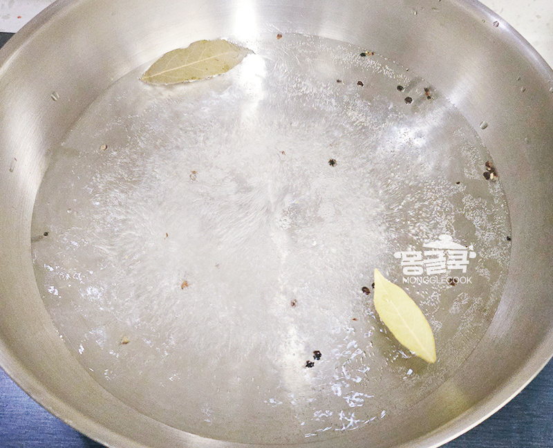 월계수잎 1~2장, 통후추 약간, 맛술 또는 소주 2~3큰술을 넣고 끓여주세요.