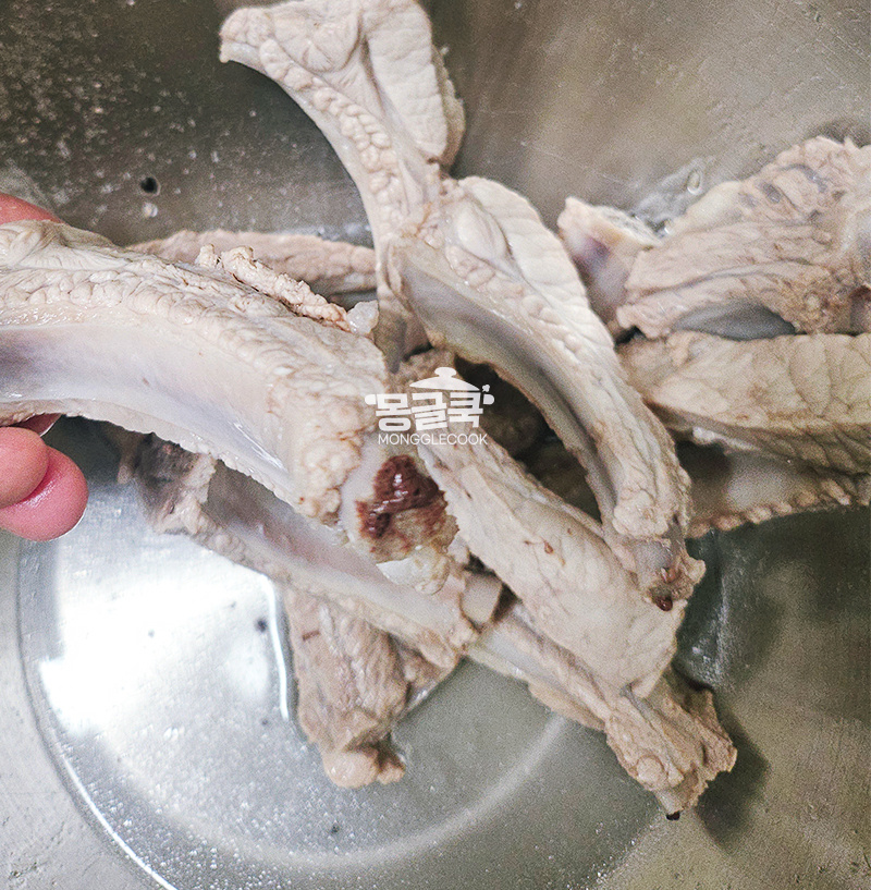 데친 등갈비는 찬물에 헹구며 뼈 사이의 잔여물까지 손으로 문질러 깨끗이 씻어주세요