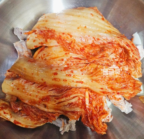 잘 익은 김치 1/4포기를 등갈비 위에 넉넉하게 올리고 김치 국물 1/2컵을 부어주세요.