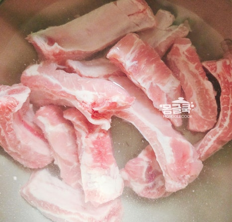 등갈비는 찬물에 30분~1시간 정도 담가 핏물을 빼주세요.