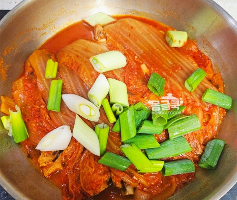 고기가 충분히 익고 김치가 흐물흐물해지면 대파와 고추를 넣어 5분만 더 끓여 마무리해 주세요.
