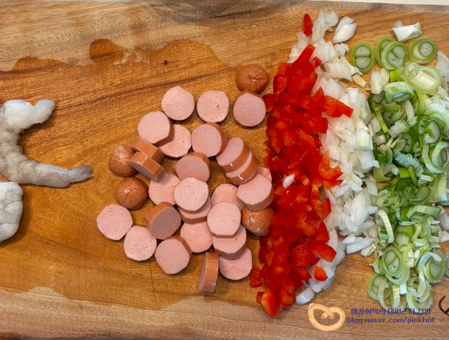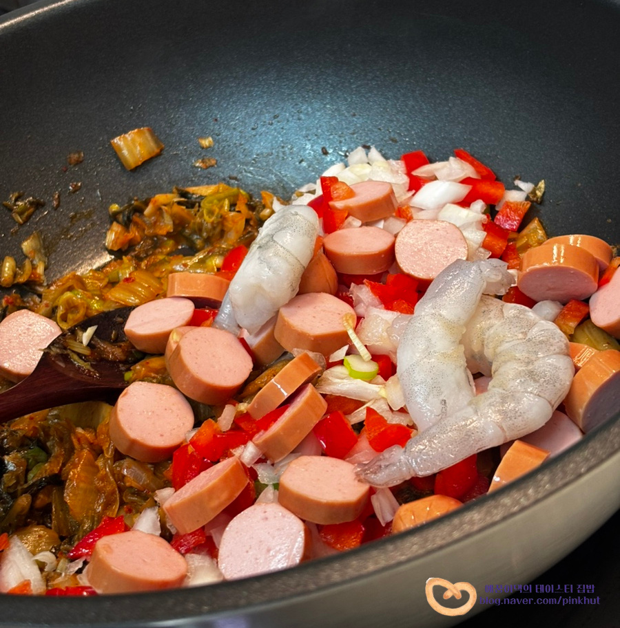 김치 170g , 소세지 또는 베이컨 2~4줄 , 냉동새우 3마리 (생략 가능), 양파 작은 것 1/2개 , 대파 1/2대 , 파프리카 1/3개